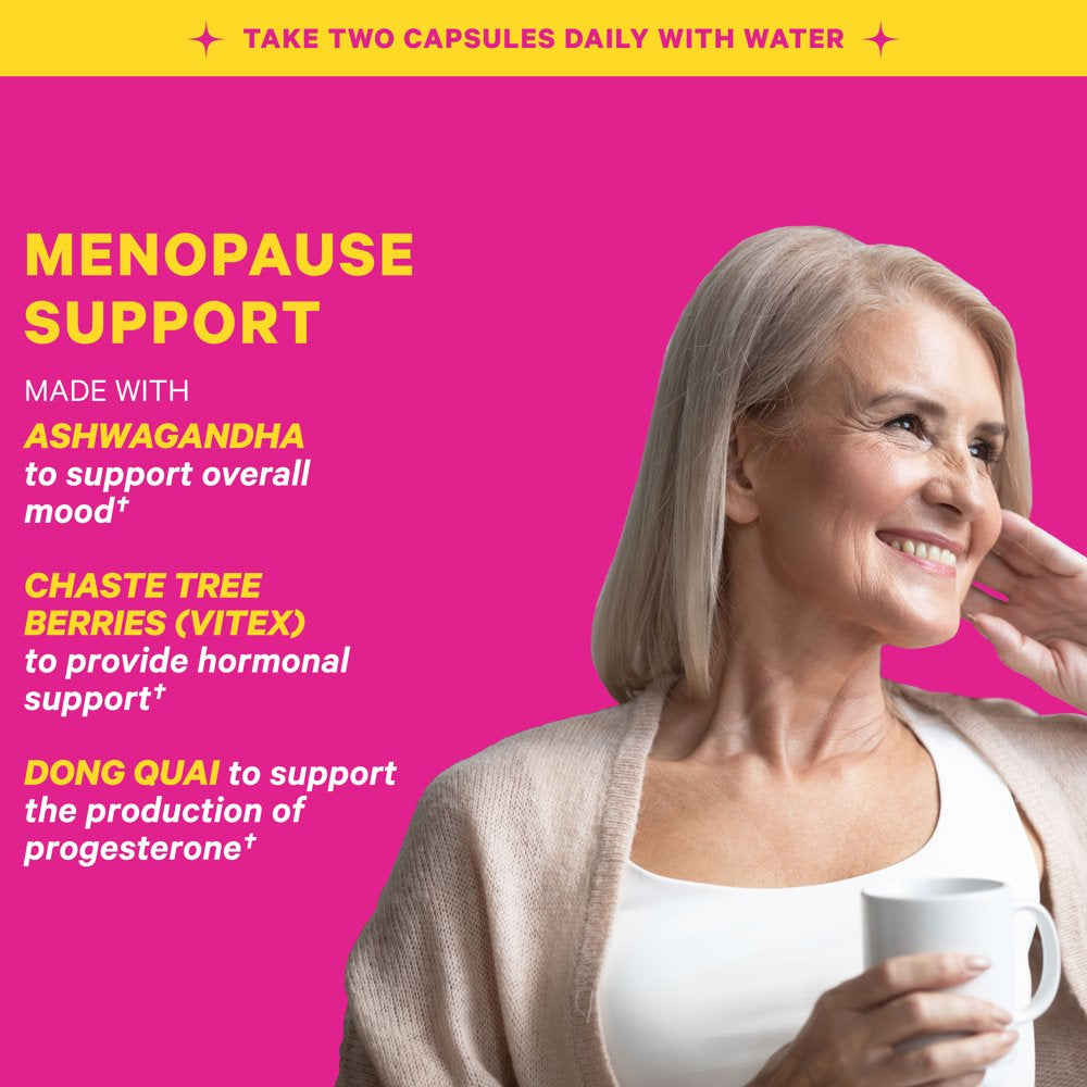 - Supports menopausal symptoms, including: hot flashes, hormone health, and feelings of stress