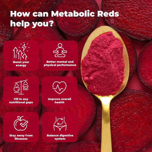 THE ULTIMATE IN ANTI-AGING – Doctor-Approved METABOLIC REDS+ is a fantastic super food that will get you hooked on feeling revitalized. The 4 premium quality blends help balance critical systems. Plus, 5 probiotics and 5 digestive enzymes improve digestion and gut microbiome (flora) health that creates immunity boost and skyrockets your overall well-being! PREBIOTICS & ANTIOXIDANTS GALORE – 23 Organic fruit, berries, and veggies overflow with the essential elements and cellular nutrient building blocks to jump-start sluggish systems back into full power. Potent antioxidants neutralize damaging free radicals that cause premature aging and lead to disease. ADAPTOGENS MAGIC – potent adaptogens, including American Ginseng, Korean Red Ginseng, Jiaogulan, and Ashwagandha powder. These forces of nature help restore balance to the immune system, reducing overactive markers and enhancing weak areas. They improve resistance to stress and aging. DIGESTIVE ENZYMES – As you age, it becomes more challenging to digest your foods properly and absorb nutrients. You’ll find 5 digestive enzymes, including protease, amylase, cellulase, lipase, and lactase. These help your body break down food into tiny particles, increasing nutrient absorption and cellular fuel! That’s a real energy booster! PROBIOTICS & MICROBIOME NOURISHMENT – you’ll get a blend of 4 probiotics, including Bacillus coagulans, Lactobacillus acidophilus, Bifidobacterium lactis, and Lactobacillus reuteri. Probiotics help alleviate intestinal permeability (Leaky Gut), diarrhea, constipation, bloating, gas, allergies, skin disorders, and support healthy immunity.