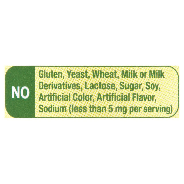 • No gluten, yeast, wheat, milk or milk derivatives, lactose, sugar, soy, artificial color, or artificial flavor
