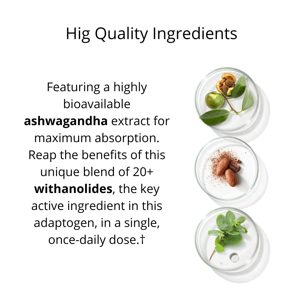 All the benefits of adaptogens: Combat everyday stress, support low mood, and promote mental clarity with this premium blend of herbal extracts known for their adaptogenic effects.† Supports a healthy stress response: Formulated with Prolanza™ Ashwagandha, Rhodiola rosea, vitamin B6 and L-theanine to help your body adapt to stressors and promote relaxation and balance.† Supports mental stamina: Stay sharp and support memory and focus with ashwagandha, cocoa bean extract (theobromine), and Rhodiola rosea.†