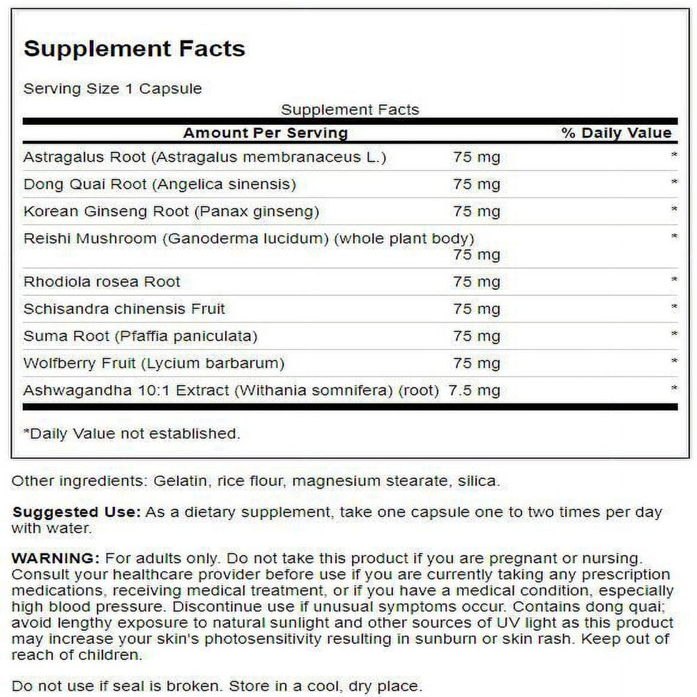 Ashwagandha Root 75 mg *,Astragalus Root 75 mg *,Dong Quai Root 75 mg *,Korean Ginseng Root 75 mg *,Reishi Mushroom 75 mg *,Rhodiola rosea Root 75 mg *,Schisandra chinensis Fruit 75 mg *,Suma Root (Pfaffia paniculata) 75 mg *,Wolfberry Fruit (Lycium barbarum) 75 mg *,Other ingredients: Gelatin, may contain one or both of the following: magnesium stearate, silica.,As a dietary supplement, take one capsule one to two times per day with water.,Do not take this product if you are pregnant/div>