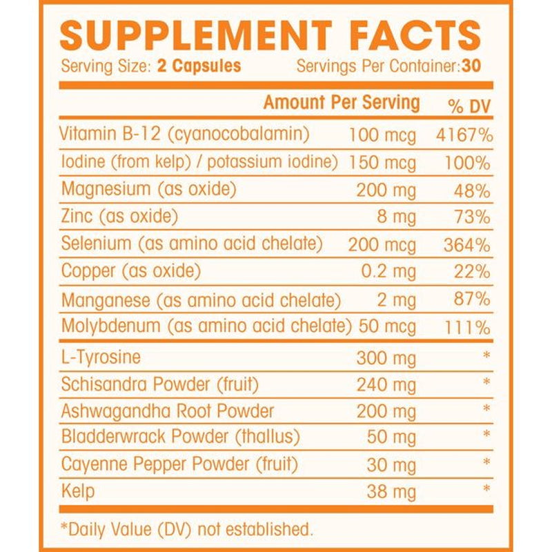 - NATURAL FORMULA – Our formula contains an all-natural blend of vitamins, minerals, herbs and amino acids thought essential for thyroid hormone production such as Vitamin B-12, iodine, magnesium, zinc, copper, manganese, molybdenum, l-tyrosine, schizandra, ashwagandha root, bladderwrack, kelp, cayenne pepper, plus selenium 100 mcg.
