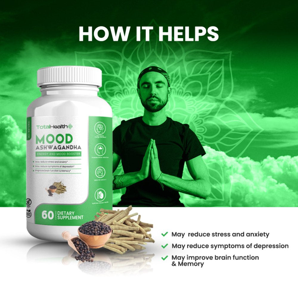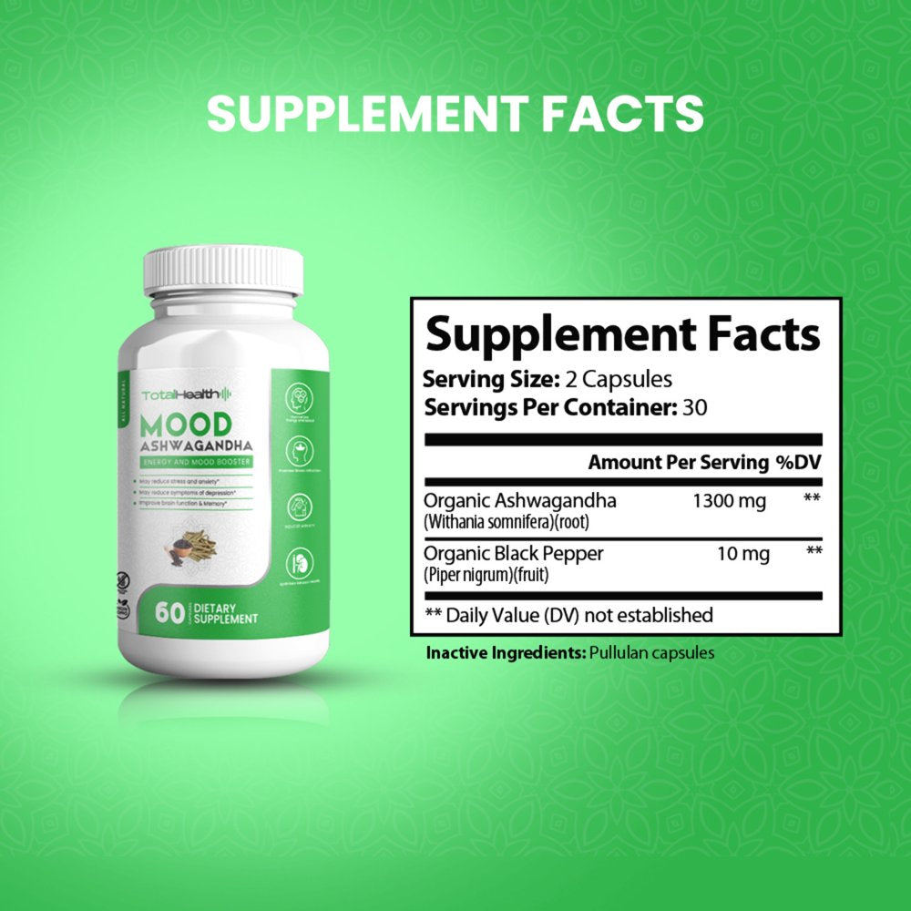 • QUANTITY AND DIRECTIONS: Total Health Ashwagandha Mood Stabilizer contains 60 capsules per container. As a dietary supplement take 2 capsules once a day. For best results take 20 – 30 minutes before a meal or as directed by your healthcare professional.
