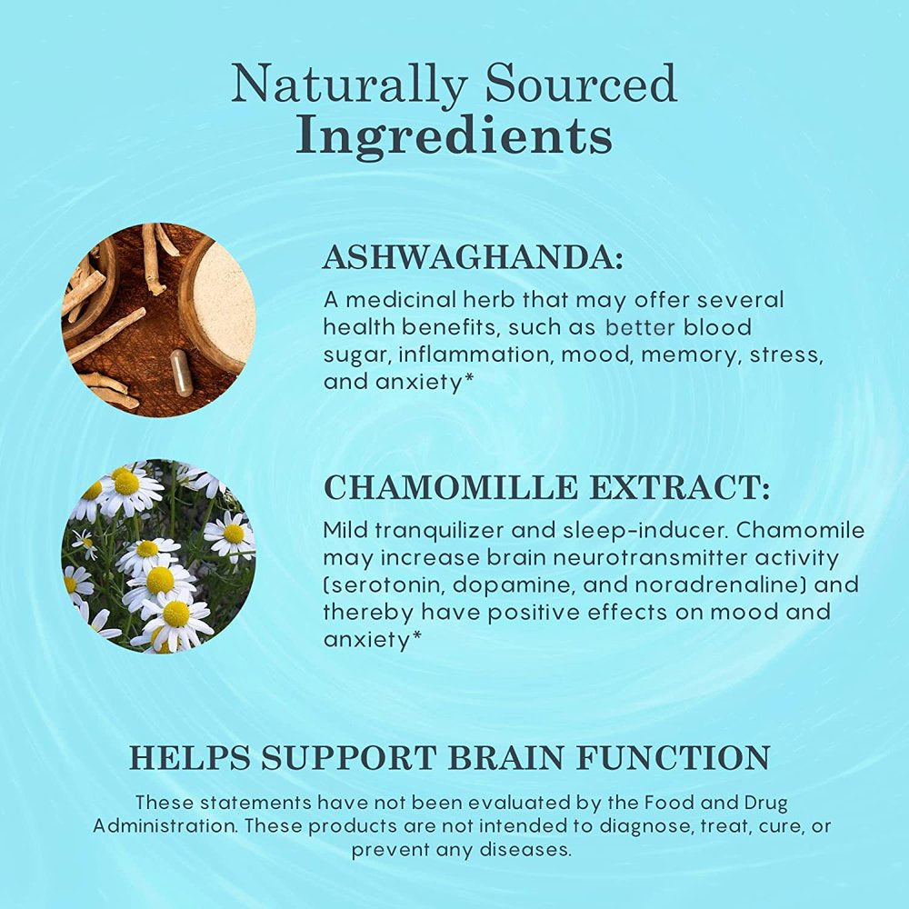 - Brain Supplements for Memory and Focus: Our memory supplement for brain assisting formula comprises Ashwagandha, Chamomile, and Pyridoxine HCL (Vitamin B6). These ingredients have been used for centuries to naturally promote a sense of calm without experiencing drowsiness, and also help to protect the nervous system from environmental stressors.