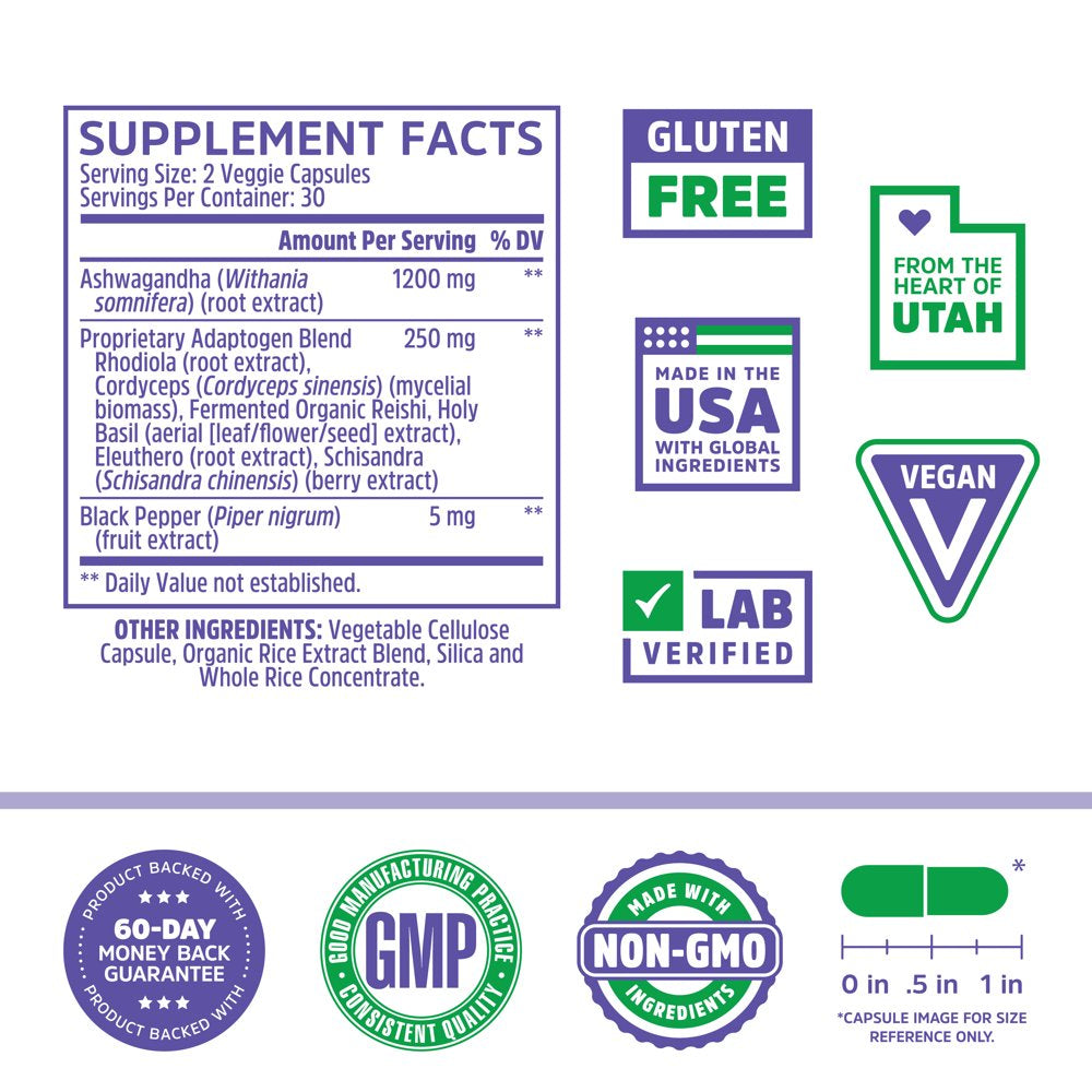 Ashwagandha (Withania somnifera) (root extract), Proprietary Adaptogen Blend (Rhodiola Root Extract, Cordyceps Mushroom, Organic Reishi Mushroom, Holy Basil Extract, Eluthero Root Extract, and Schisandra Extract), Black Pepper (Piper nigrum) (fruit extract), Other Ingredients: Whole Rice Concentract, Vegetable Cellulose Capsule, Silica and Magnesium Stearate/div>