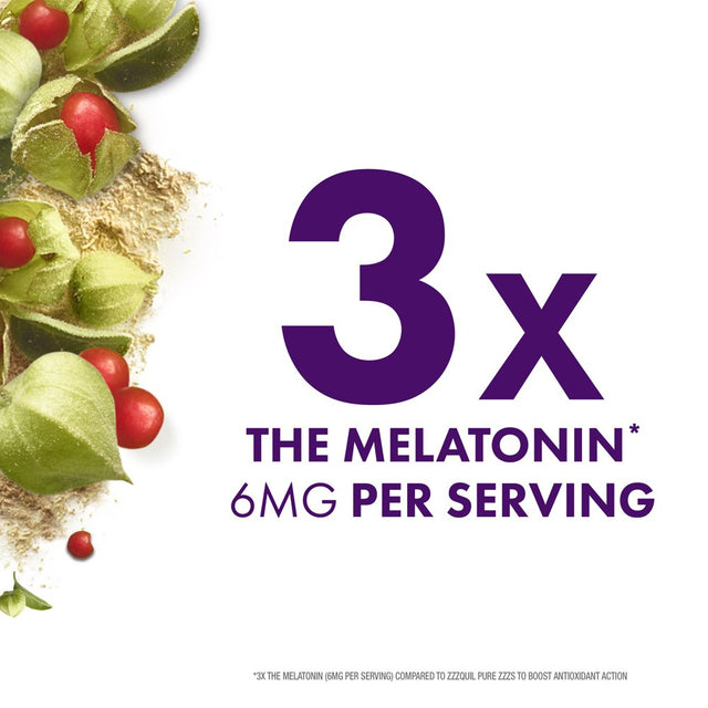 Everyone deserves a good night's sleep. ZzzQuil PURE Zzzs Triple Action Melatonin Gummies support sleep, calm mood & antioxidant action. Formulated with 3x the melatonin (6mg per serving) compared to ZzzQuil PURE Zzzs to boost antioxidant action, ZzzQuil PURE Zzzs Triple Action Melatonin Gummies help you fall asleep naturally so that you are ready to take on your tomorrow*. ZzzQuil PURE Zzzs - Naturally Superior Sleep. THESE STATEMENTS HAVE NOT BEEN EVALUATED BY THE FOOD AND DRUG ADMINISTRATION. THIS PRODUCT IS NOT INTENDED TO DIAGNOSE, TREAT, CURE, OR PREVENT ANY DISEASE.