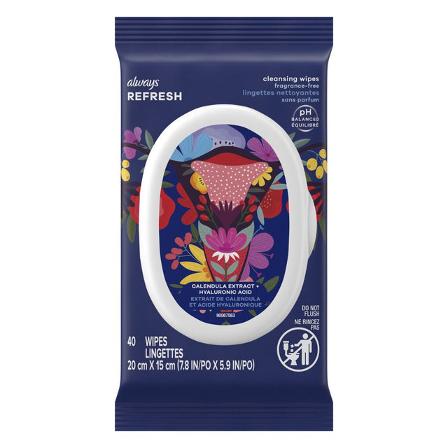 Always REFRESH Cleansing Wipes are pH balanced and gynecologist & dermatologist tested. These wipes are alcohol-free and made without fragrance, parabens, sulfates, and dyes. The Always cleansing wipes are made with hyaluronic acid, calendula extract, and botanical fiber. Our wipes are specially formulated to wipe away odor-causing bacteria and residues down there, leaving you feeling refreshed! 40 Total count wipes.