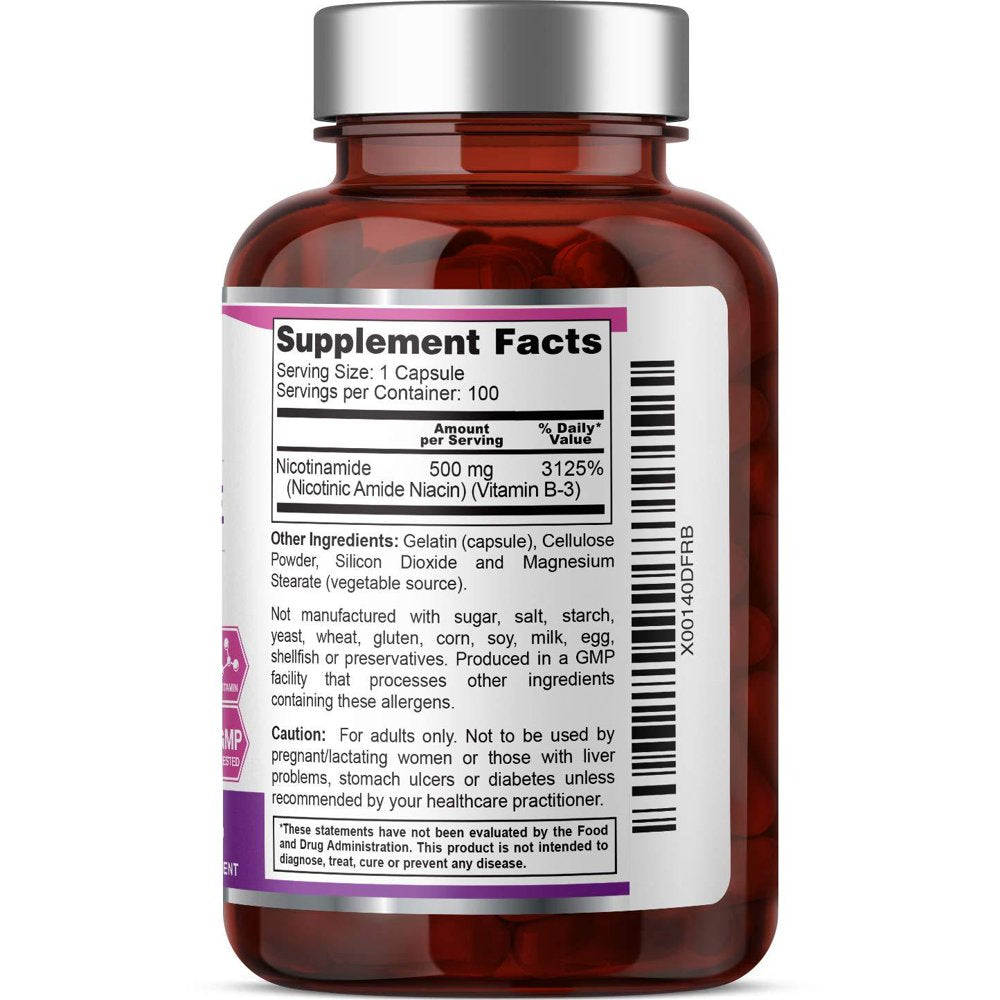 B-3 Nicotinamide 500 Mg 100 Capsules - Natural Flush-Free Vitamin Formula | Gluten-Free Nicotinic Amide Niacin | Supports Skin Health | Healthy Cell Repair