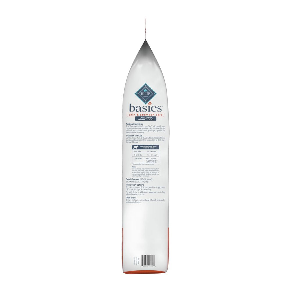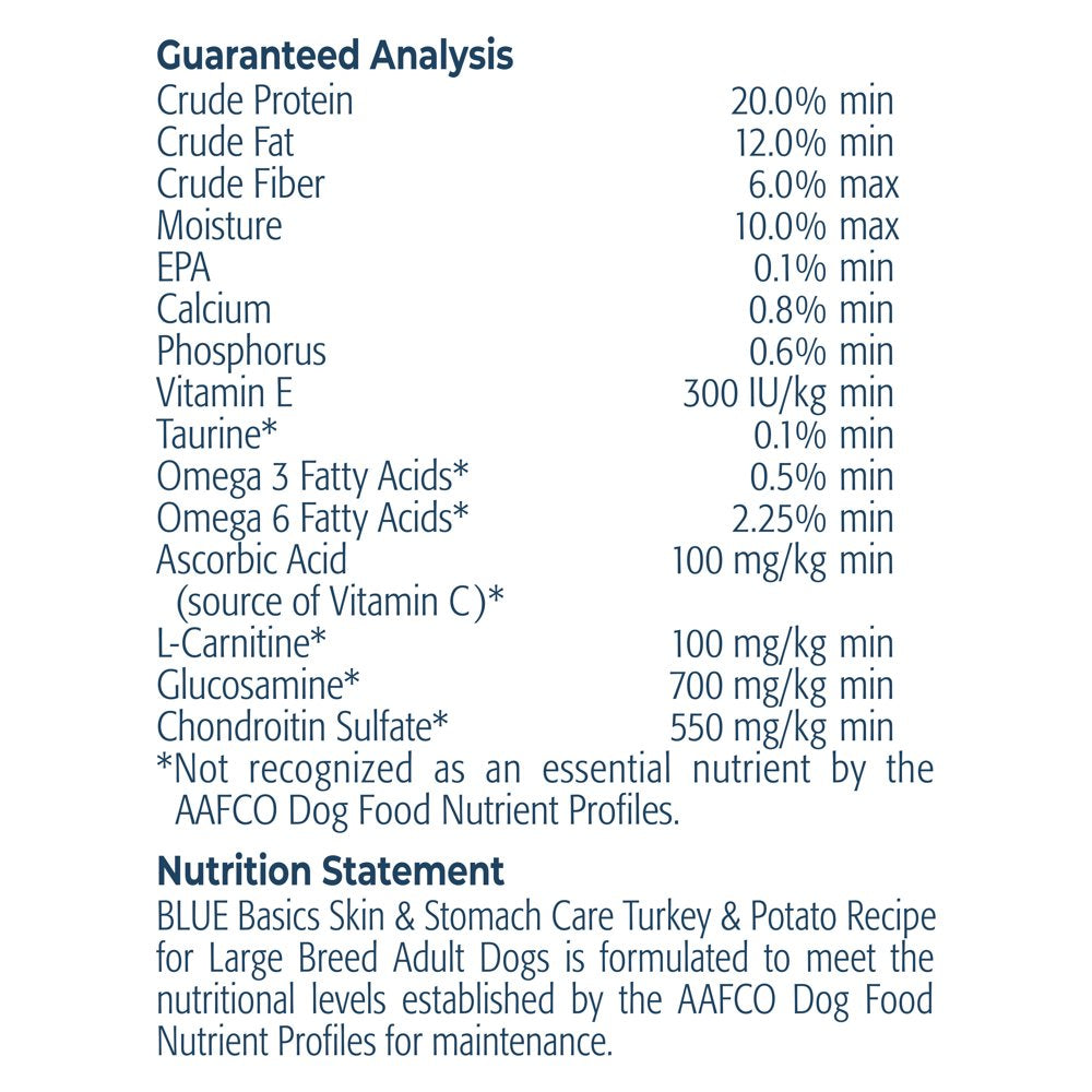 BLUE Basics Turkey and Potato Recipe for Large Breed Adult Dogs is a deliciously simple limited-ingredient diet for skin and stomach care. Its designed to support healthy skin and gentle digestion. This dry dog food starts with real turkey as its only animal protein source and contains no corn, wheat, soy, dairy, or eggs, making it ideal for dogs with food sensitivities. This BLUE Basics adult formula contains Glucosamine, Chondroitin, and EPA to support your large breed dogs joint function and overall mobility. Like all BLUE dry foods, BLUE Basics includes exclusive antioxidant-rich LifeSource Bits, which are cold-forme to retain their potency. Give your dog the balanced nutrition of BLUE Basics today. BLUE Basics is brought to you by Blue Buffalo, the leader in natural pet food. Blue Buffalo makes premium-quality pet foods featuring real meat first, wholesome whole grains, and healthy fruits and vegetables. Love them like family. Feed them like family.