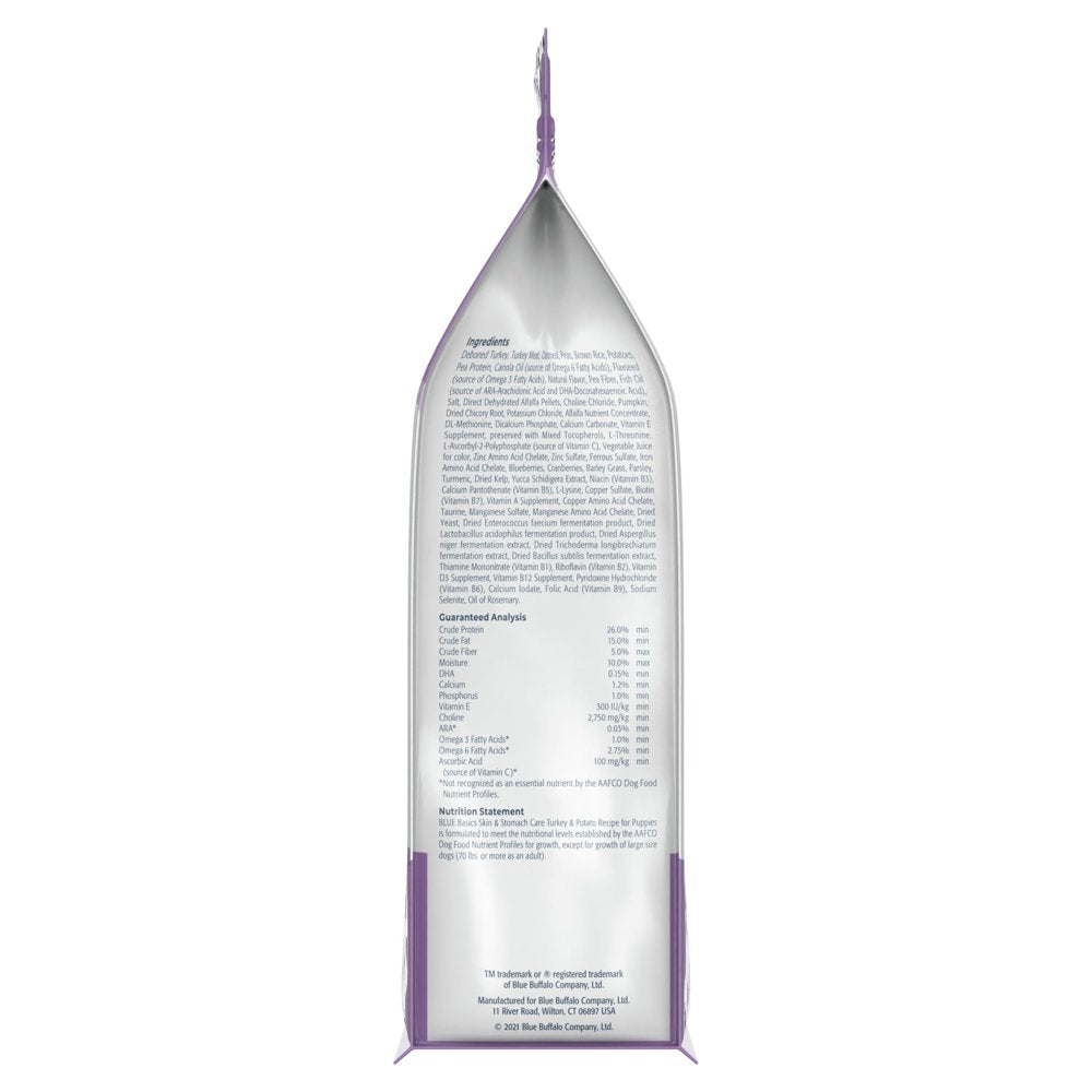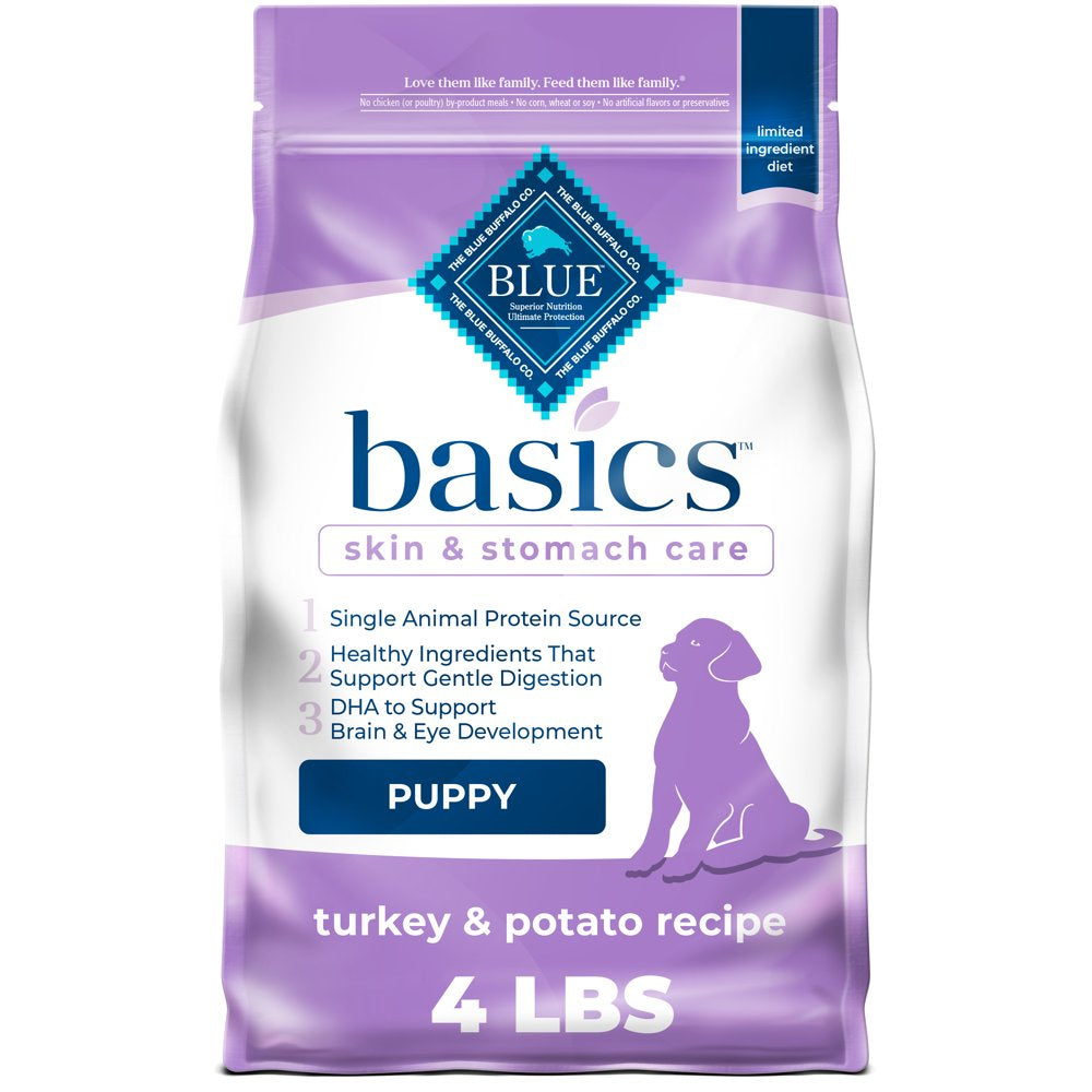 - Contains one (1) 4lb bag of BLUE Basics Skin & Stomach Care, Natural Puppy Dry Dog Food, Turkey & Potato