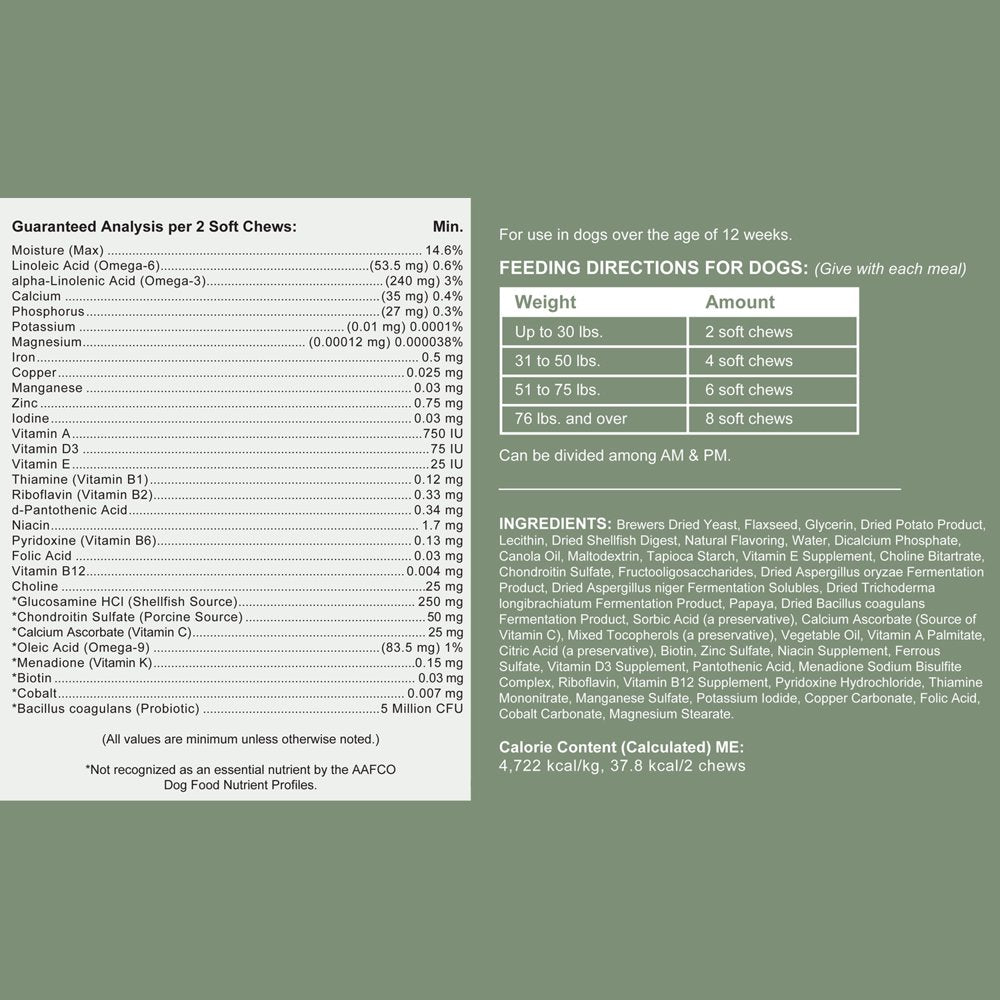 - MADE IN AMERICA: Along with those ingredients come all the vital minerals your dog needs every day, including calcium, vitamin A, B, C, D, & E, magnesium, iron, folic acid, biotin and more. Check the bottle for dosage recommendations, 120 chews is up to a 60 day supply! The treats are delicious!