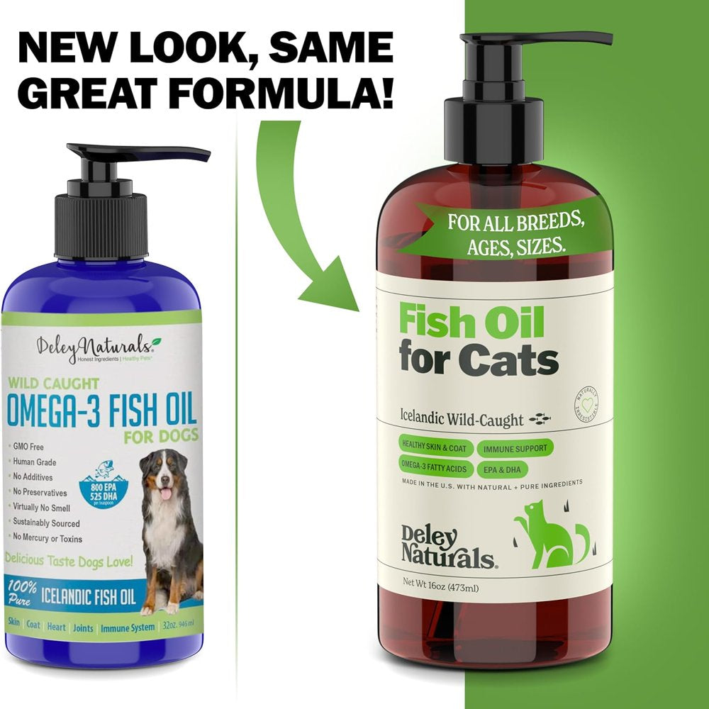 • LIQUID FISH OIL FOR CATS - Deley Naturals Wild Caught Omega 3 Fish Oil Liquid for Cats is 100% pure fish oil and has no added ingredients. Our all natural, sustainably sourced fish oil supplement has virtually no odor but has a delicious fish flavor all dogs love