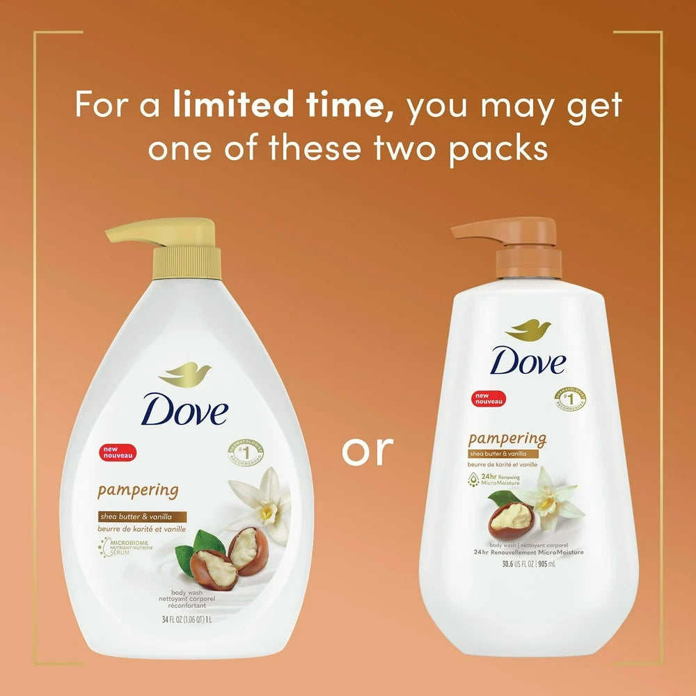 - 24HR RENEWING MICRO-MOISTURE: Dove Pampering Shea Butter & Vanilla Body Wash, with 24 hr Renewing Micro-Moisture, shea butter and vanilla, for renewed, healthy-looking skin
