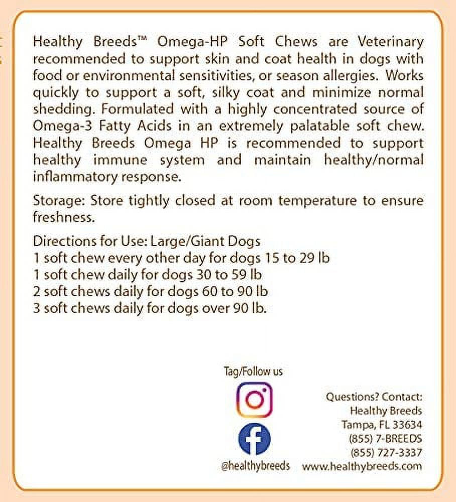 Healthy Breeds Omega HP Soft Chews are Veterinary recommended to support skin and coat health in dogs. Works quickly to support a soft, silky coat and minimize normal shedding. Formulated with a highly concentrated source of Omega-3 Fatty Acids in an extremely palatable soft chew. Healthy Breeds Omega HP is recommended to support a healthy immune system and maintain healthy/normal inflammatory response.