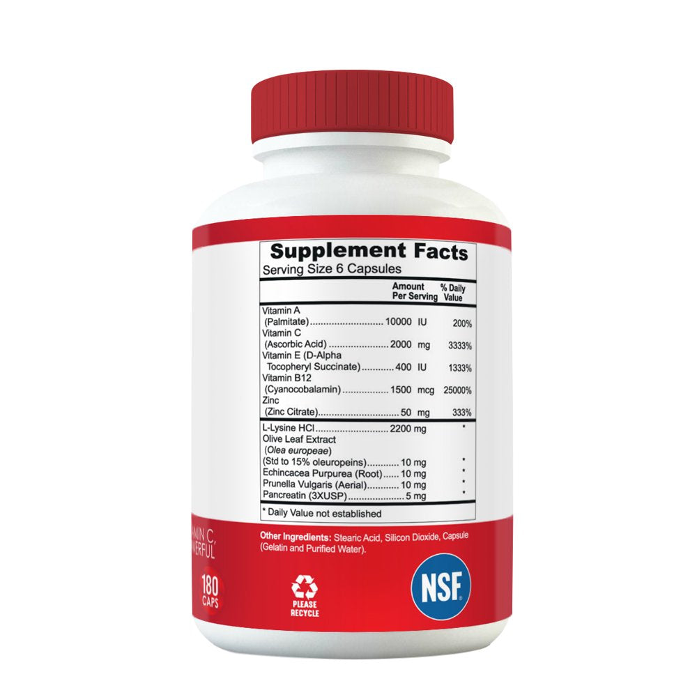 HRPVA Max Cold Sore Clear Skin Cold Sores Heal Cold Sores Immune Support Supplements Vitamins Supplements L-Lysine Olive Leaf, Pancreatin, B12 Vitamin C, B-Complex, Prunella Vulgaris, Vitamin E, Echi