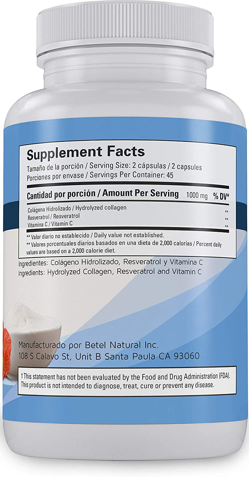 Hydrolyzed Collagen with Resveratrol and Vitamin C Capsules by Betel NaturalCollagen is a main component of our skin. Collagen is needed in the skin to improve elasticity and to allow it to look much firmer and younger. The problem comes when your skin begins to lose collagen and it becomes difficult for your body to repair the damage done throughout the years of sun exposure, harmful chemicals, and aging. Betel Natural's Hydrolized Collagen capsules reinforced with Resveratrol and Vitamin C is a great supplement to help your body obtain this necessary nutrient. Betel Natural adds Vitamin C so increase the collagen absorption and Resveratrol to fight off free radicals your body is exposed to. Begin a better you, today!βœ” Promotes healthier skin by supplementing the body with missing collagen.βœ” Contains free radical busting Resveratrol and Vitamin C.βœ” Contains Premium quality Hydrolyzed Collagen with Vitamin C to allow better absorption in the body.βœ” Manufactured in the USA!Fast ShippingItems are shipped out daily. Place your order before 4pm PST for same day shipping (Monday thru Friday) or 11am PST on Saturday.β˜…β˜…β˜… Our "Like it or Return It" Guarantee! β˜…β˜…β˜…If you don't like your product for any reason, return your item within 30 days of purchase for a 100% money back guarantee.