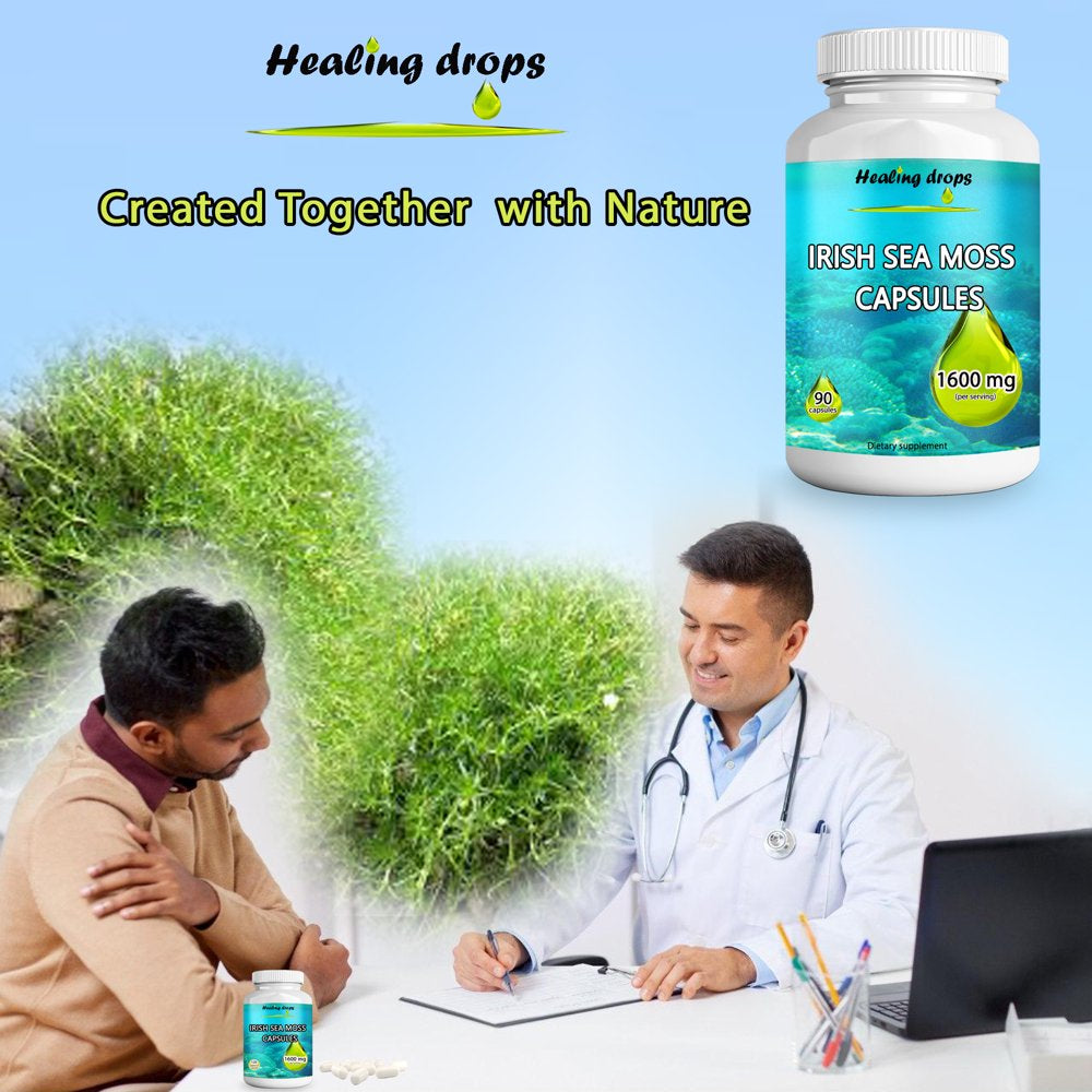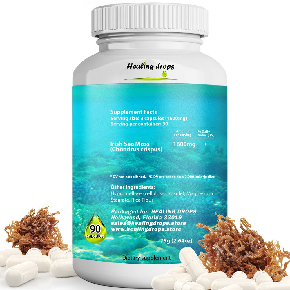 Irish Sea Moss 1600Mg – Raw Organic Sea Moss Gel Powder 120 Capsules – Keto Alkaline Non-Gmo Diet - Thyroid Joints Gut Skin Support by Healing Drops