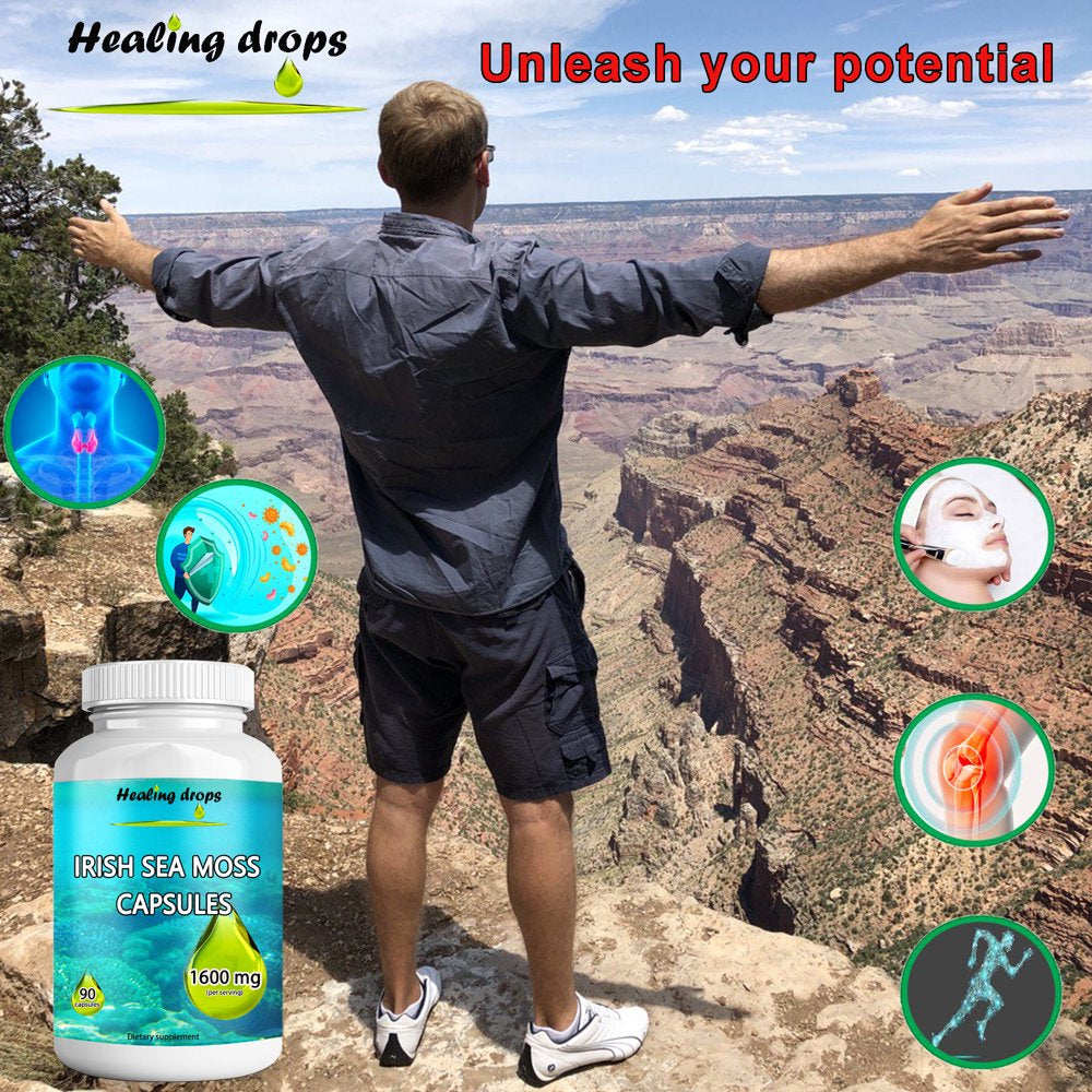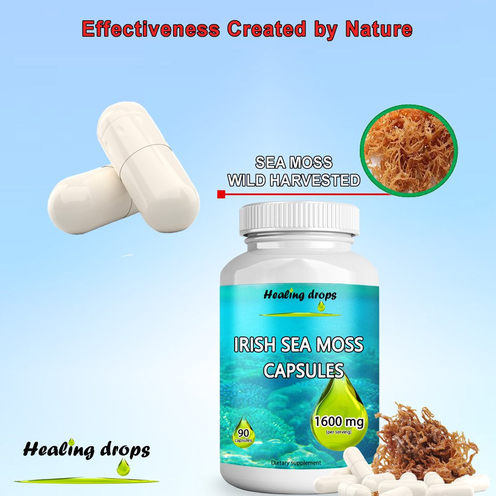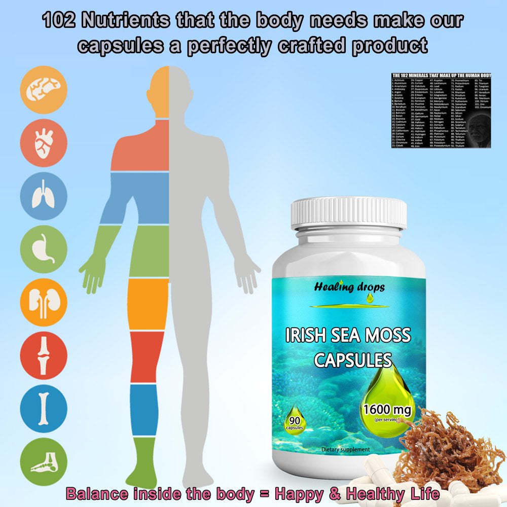 Real Irish Sea Moss Capsules(Sea Moss Gummies) is not something that you'll find in the typical American diet. It is way bigger. It is a philosophy of healthy lifestyle. “Healing Drops” Sea Moss Capsules are made of Sun-dried Sea moss and Irish Moss. It is Red Algae that grows on the Atlantic coastlines North America, Europe, and the Caribbean Islands. The Irish used it to get the nutrients they needed during times of famine. Real and True Sea Moss contains 92 minerals from the sea out of 102 needed. If you add some Bladderwrack & Burdock Root into your diet you will have all 102 nutrients that your body is needed to fully maintain homeostasis. That is the Power and Potential of the plant / Irish See Moss. Nature’s Effective Formula has been implemented in our Capsules. Irish Moss is a seaweed (chondrus crispus). It is a Super Food cells of your body have been waiting for. It is source of natural nutrients and minerals including iodine, calcium, potassium, sulfur, zinc, iron, silica, phosphorus, niacin, riboflavin, folate, manganese, choline and copper, Vitamins A B6 C E K D. Professionals about Sea Moss: Dr Sebi: “Sea Moss is ideal for those transitioning or maintaining an active plant-based lifestyle”.