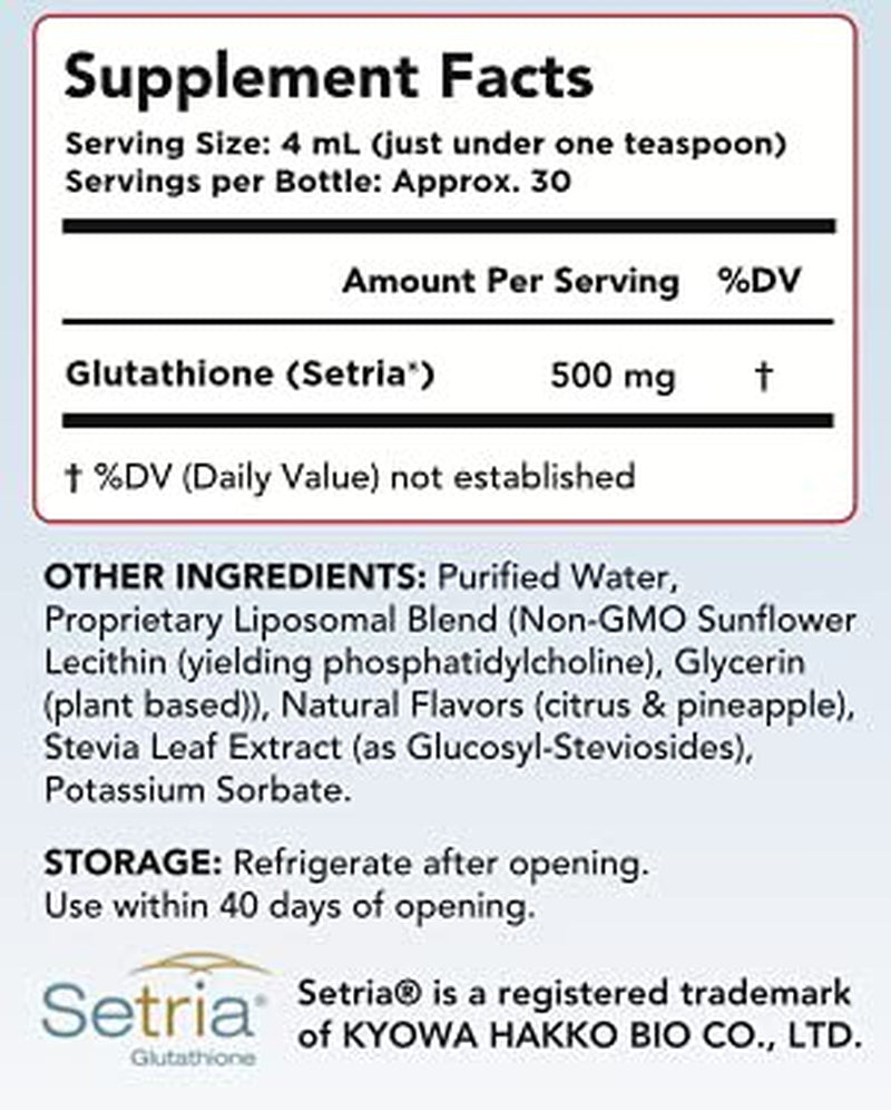 Liposomal Glutathione Supplement | Liquid Reduced Setria® L Glutathione 500Mg | Immune Support, Brain Function, Anti-Aging, Detox, Skin Health | Non-Gmo Sunflower Lecithin | Soy-Free & Vegan