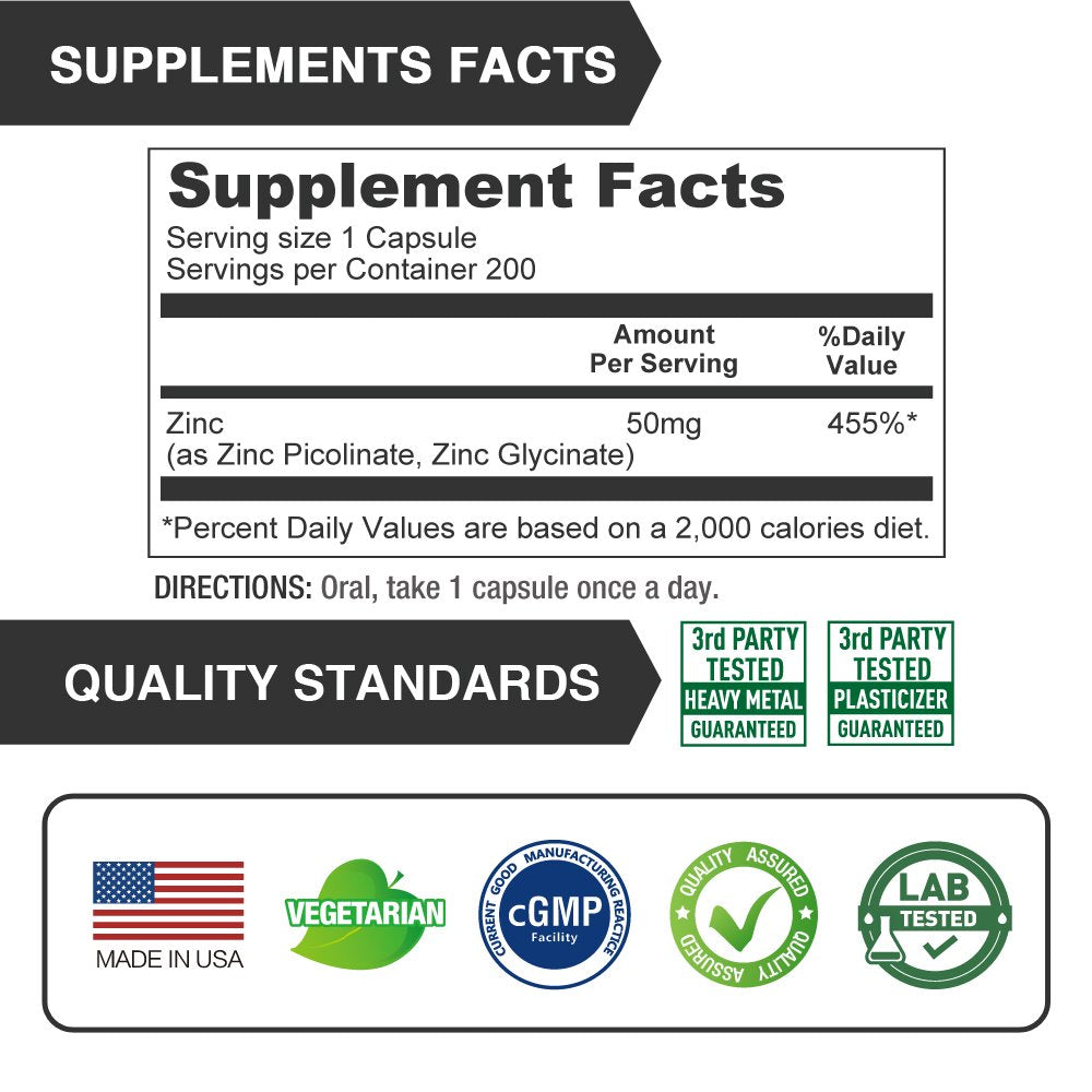 Lovita Zinc 50Mg | Potent Highly-Absorbed Chelated Zinc Supplements, Picolinate & Bisglycinate | Vegan, Gluten Free, Non-Gmo | for Immune, Antioxidant Support & Healthy Skin | 200 Capsules - 1 is backordered and will ship as soon as it is back in stock.