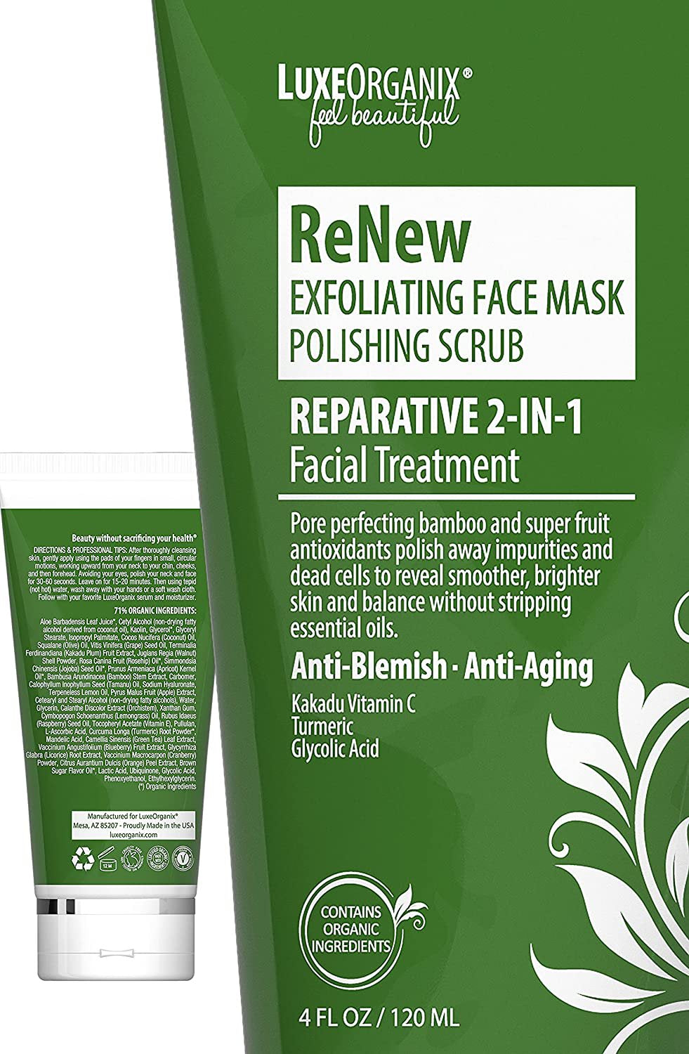 Luxe Organix - Renew 2-In-1 Face Mask and Scrub – Organic Skin Exfoliator, Blackhead Remover, Acne Treatment,