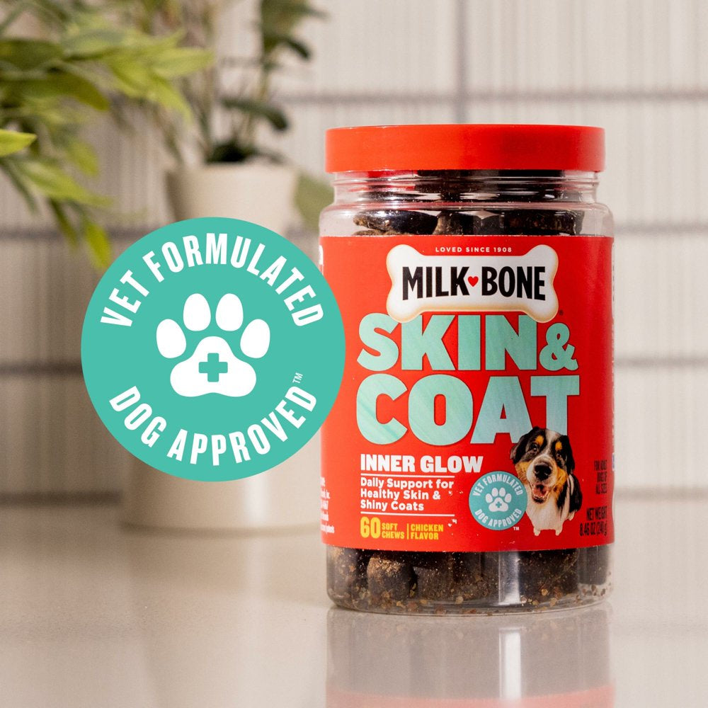 Provide daily support for healthy skin and shiny coats with Milk-Bone Skin & Coat supplements for dogs.