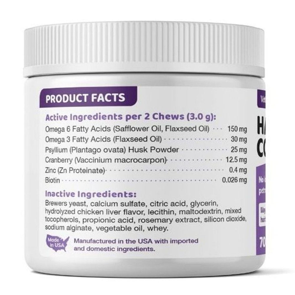 • VETERINARIAN FORMULATED - Our veterinarian formulated hairball control soft chew contains an unique mix of multi-vitamins, omega fatty acids, fiber, zinc, and biotin for skin, digestive, and coat health. In addition, our versatile formula contains cranberry and psyllium husk for added urinary tract and gastrointestinal health as well.