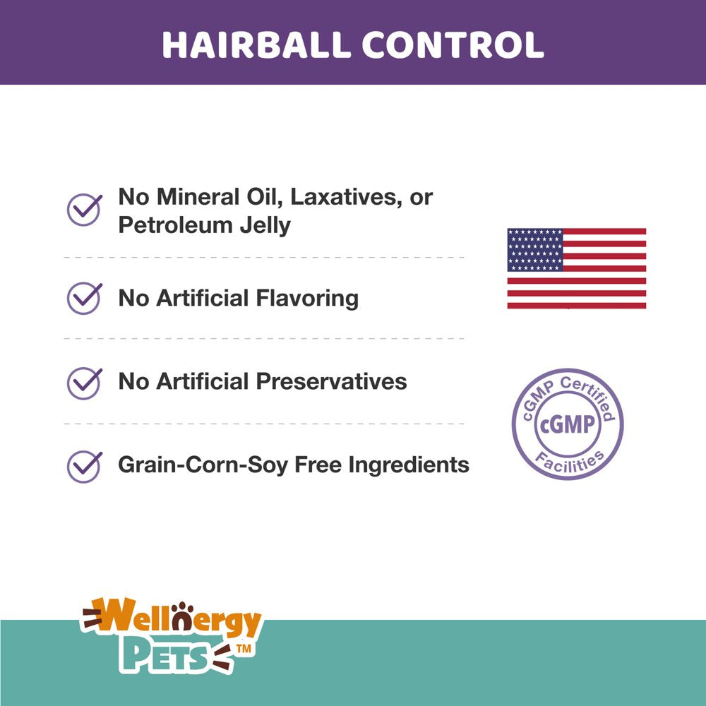 PREMIUM INGREDIENTS THAT GIVE RESULTS - NO GMOs, CORN, SOY or PRESERVATIVES - At Wellnergy Pets we’re committed to premium quality ingredients and strict safety standards for your pet. Our Hair ball Control chewable treats are a delicious chicken flavor and made in the USA with the highest-quality natural ingredients and care for your pet! Contains NO LAXATIVES OR PETROLEUM JELLY. Give your pets the ultimate best, with WellnergyPets./div>