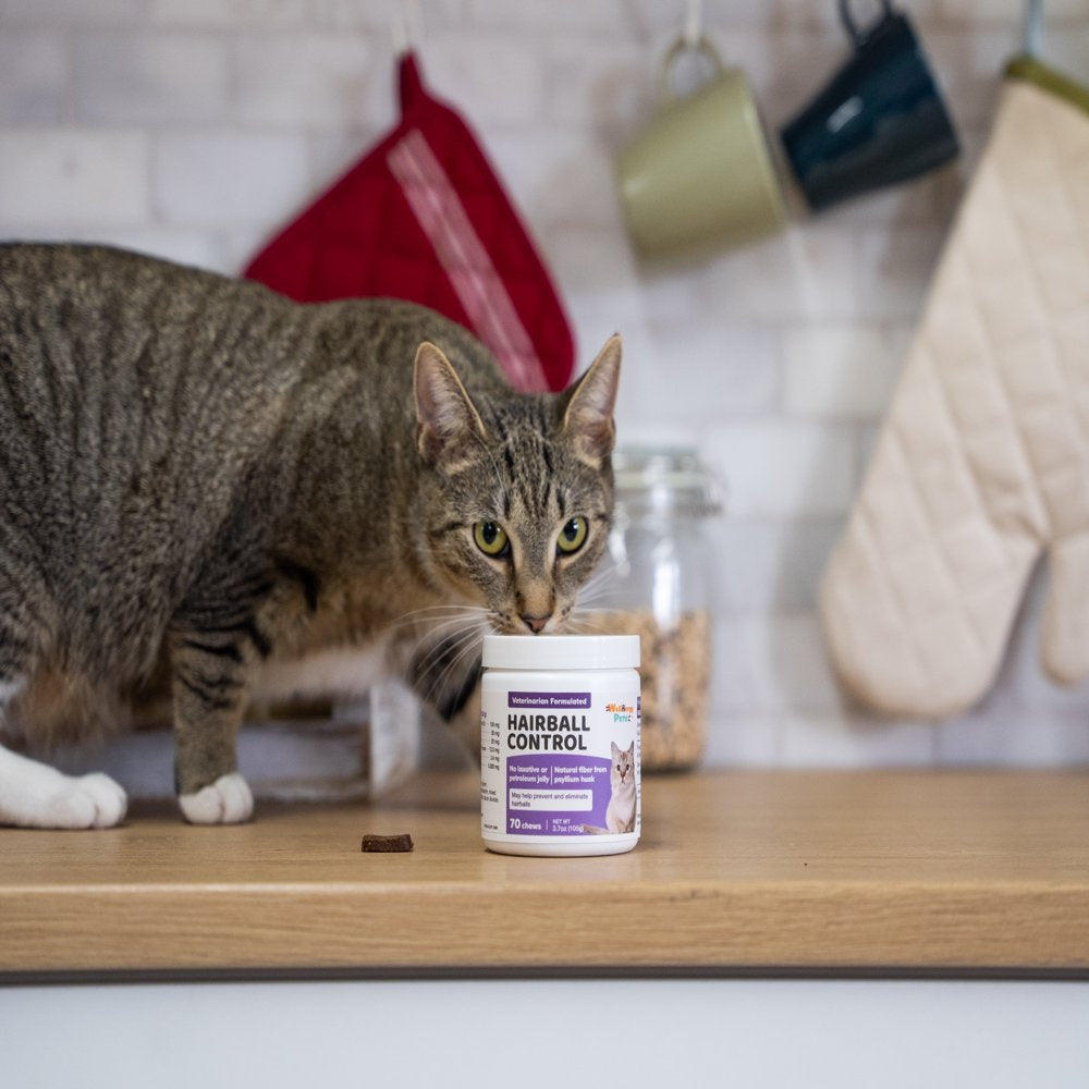 • HAIRBALL CONTROL – works to prevent and eliminate hairball formation by promoting a healthy GI tract on the inside and healthy skin on the outside without the use of any laxative or mineral oil. NATURAL FIBER addition from PSYLLIUM HUSK helps our hairball control supplements with management of gastrointestinal and stool health.