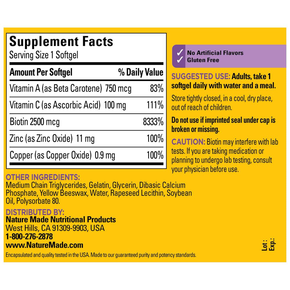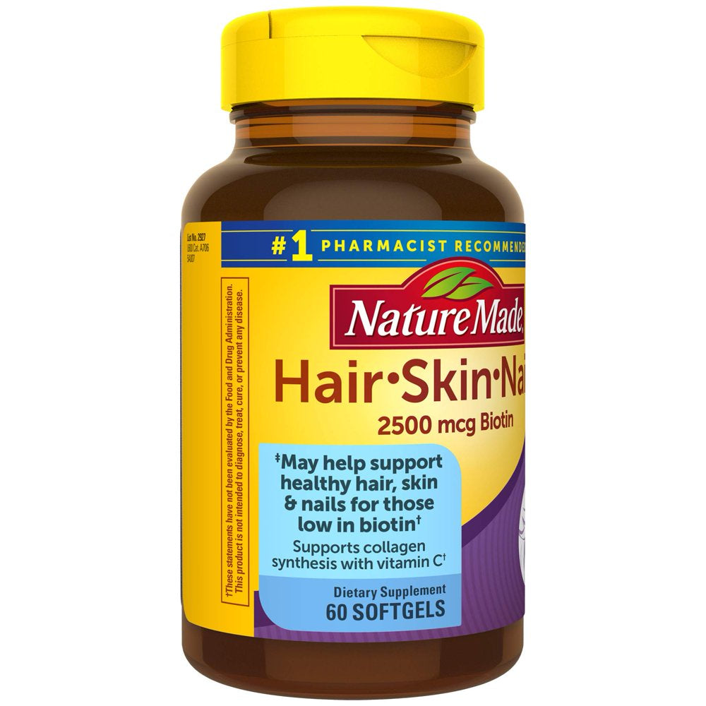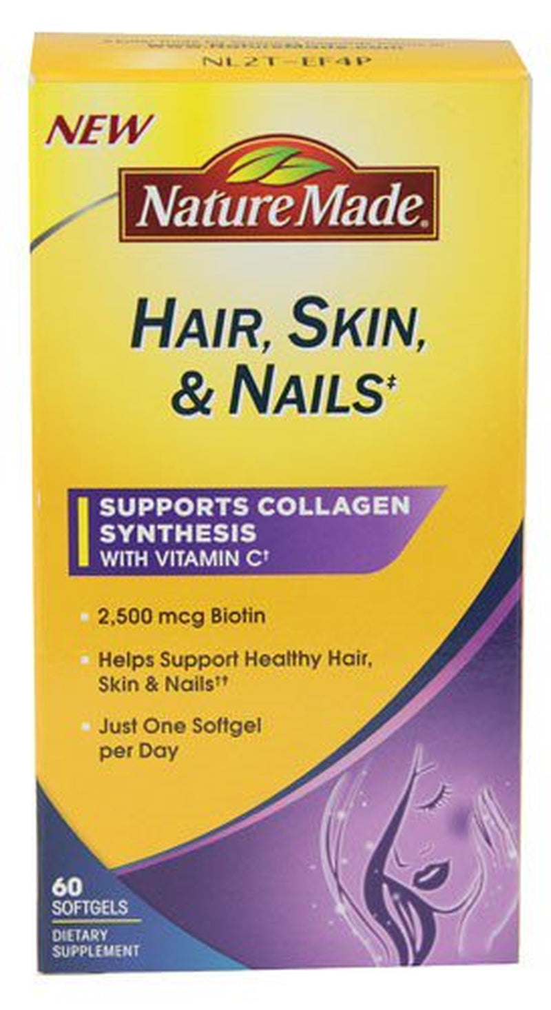 Nature Made - Hair, Skin, & Nails - 60 Softgels Nature Made Hair, Skin, & Nails formulated with five key nutrients for supporting healthy hair, skin and nails in one small softgel. It's formula includes 2,500 mch biotin and 100 mg vitamin C per serving. Vitamin C helps support collagen synthesis while biotin helps support healthy hair, skin and nails.