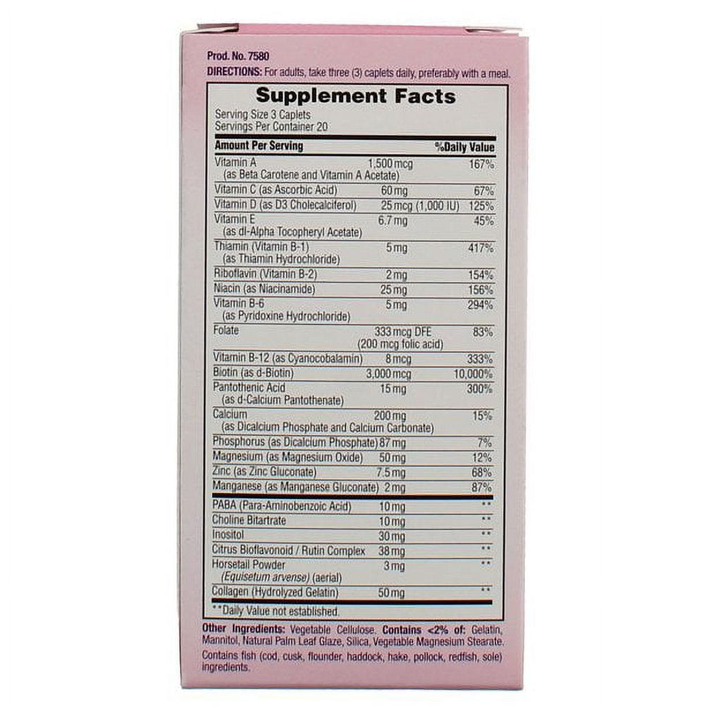 - Pack of 2 for the UPC: 074312075803 The company for all your vitamin and nutritional needs.Dietary SupplementNat/BountyActive Ingredients:3 Tablets: Vitamin A (as Retinyl Palmitate) 5000 IU; Vitamin C (as Ascorbic Acid) 120 mg; Vitamin D (as Cholecalciferol) 100 IU; Vitamin E (as d-Alpha Tocopheryl Acetate) 15 IU; Thiamin (Vitamin B-1) (as Thiamine Hydrochloride) 5 mg; Riboflavin (Vitamin B-2) 5 mg; Niacin (as Niacinamide) 25 mg; Vitamin B-6 (as Pyridoxine Hydrochloride) 5 mg; Folic Acid 200 mcg; Vitamin B-12 (as Cyanocobalamin) 8 mcg; Biotin (as d-Biotin) 3000 mcg (3 mg); Pantothenic Acid (as d-Calcium Pantothenate) 15 mg; Calcium (as Calcium Carbonate, Dicalcium Phosphate) 707 mg; Iron (as Ferrous Gluconate) 3 mg; Phosphorus (as Dicalcium Phosphate) 150 mg; Iodine (as Potassium Iodide) 112.5 mcg; Magnesium (as Magnesium Oxide) 100 mg; Zinc (as Zinc Gluconate) 7.5 mg; Selenium (as L-Selenomethionine) 12.5 mcg; Manganese (as Manganese Gluconate) 5 mg; Sodium 10 mg; PABA (Para-Aminobenzoic Acid) 25 mg; Choline Bitartrate 75 mg; Inositol 30 mg; Ribonucleic Acid (RNA) 30 mg; Citrus Bioflavonoids (Citrus Spp.) (Fruit) 25 mg; Rutin 12.5 mg; Horsetail Extract (Equisetum Arvense) (Aerial) 3 mg; Betaine Hydrochloride 25 mg; Cellulose (Plant Origin); Vegetable Cellulose; Croscarmellose; Silica; Vegetable Magnesium Stearate; Vegetable Cellulose Coating; Gelatin; Mannitol For adults: take three (3) tablets daily, preferably with meals. Store in a cool, dry place.Uses:Nature's Bounty Hair, Skin and Nails Strengthening and Nourishing Formula provides a combination of nutrients, including Vitamin C and Biotin, that support the structural foundation of your hair, skin and nails.* No Artificial Color or Flavor, No Sugar, No Milk, No Lactose, No Gluten, No Wheat, No Fish. Sodium Free.If you are pregnant, nursing, taking any medications or planning any medical procedure, consult your doctor before use. Discontinue use and consult your doctor if any adverse reactions occur. Not intended for use by persons under the age of 18. Keep out of reach of children. Accidental overdose of iron containing products is a leading cause of fatal poisoning in children under six. KEEP THIS PRODUCT OUT OF REACH OF CHILDREN. *This statement has not been evaluated by the Food and Drug Administration. This product is not intended to diagnose, treat, cure or prevent any disease.