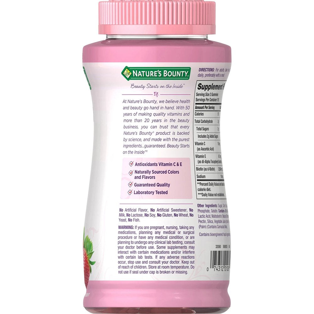 From the #1 brand for hair, skin, and nails, Nature's Bounty Hair, Skin & Nails Gummies contains both biotin and vital nutrients to support beautiful hair, glowing skin and healthy nails from the inside out. Each serving of delicious strawberry-flavored biotin gummies contains antioxidants vitamin E and vitamin C. Vitamin E contributes to skin health; vitamin C is involved in collagen production and formation, which forms the basis for vibrant skin; and biotin helps to maintain healthy hair. Every Nature's Bounty beauty supplement is backed by a combination of nature and science, and made with the purest ingredients, guaranteed. This unique formula is laboratory-tested plus it is free of milk, lactose, soy, gluten, wheat, yeast and fish. If you’re hoping to look and feel your best, Nature's Bounty Hair, Skin & Nails vitamins for women are a great addition to your everyday beauty routine and a delicious way to support your natural beauty from within.