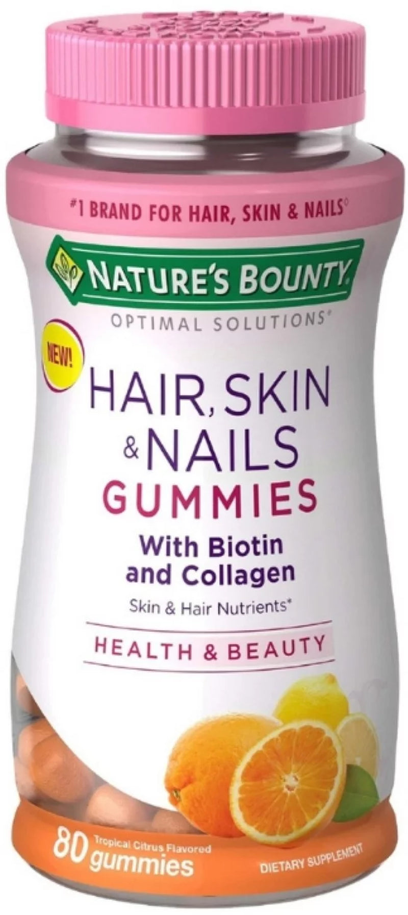 • WITH BEAUTY-SUPPORTING BIOTIN PLUS COLLAGEN.* Nature's Bounty Hair, Skin & Nails with Biotin and Collagen Gummies contain beauty-supporting biotin, a vital nutrient that helps to maintain healthy hair while supporting overall beauty, and 100 mg of collagen, a popular beauty ingredient*