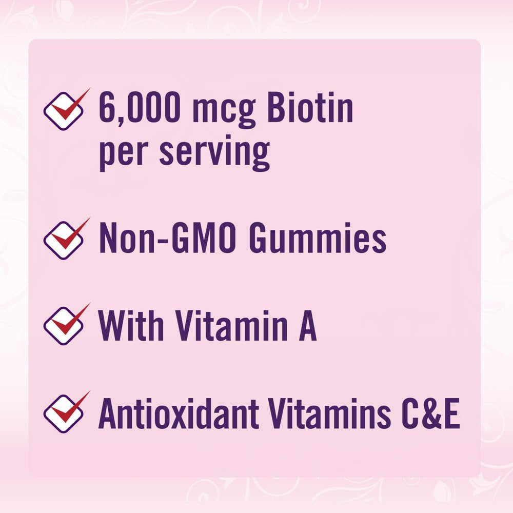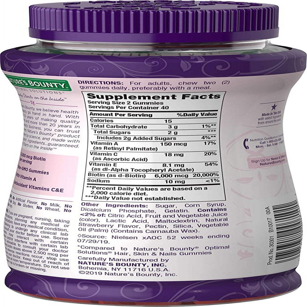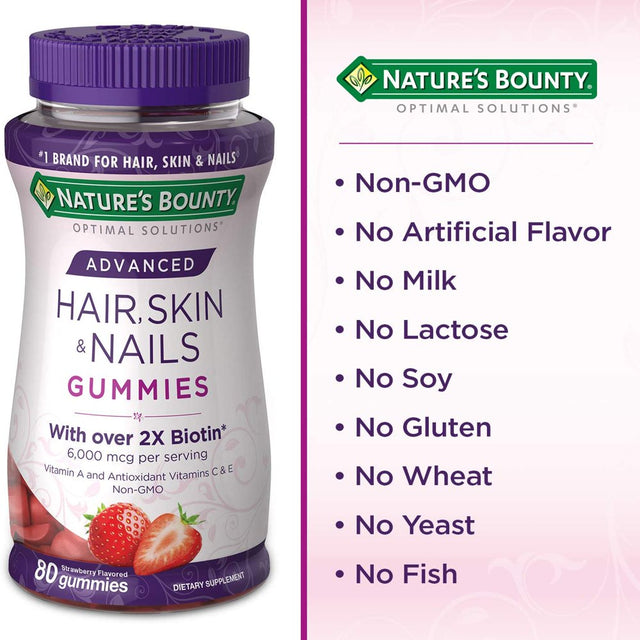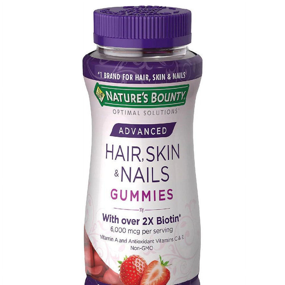 Nature's Bounty Optimal Solutions Advanced Hair, Skin & Nails Gummies, 6000mcg - 230 ct Product Details: 6,000 mcg of biotin per serving Over 2x more biotin vs standard gummies Vitamin A and antioxidant Vitamins C & E Non-GMO Gummies