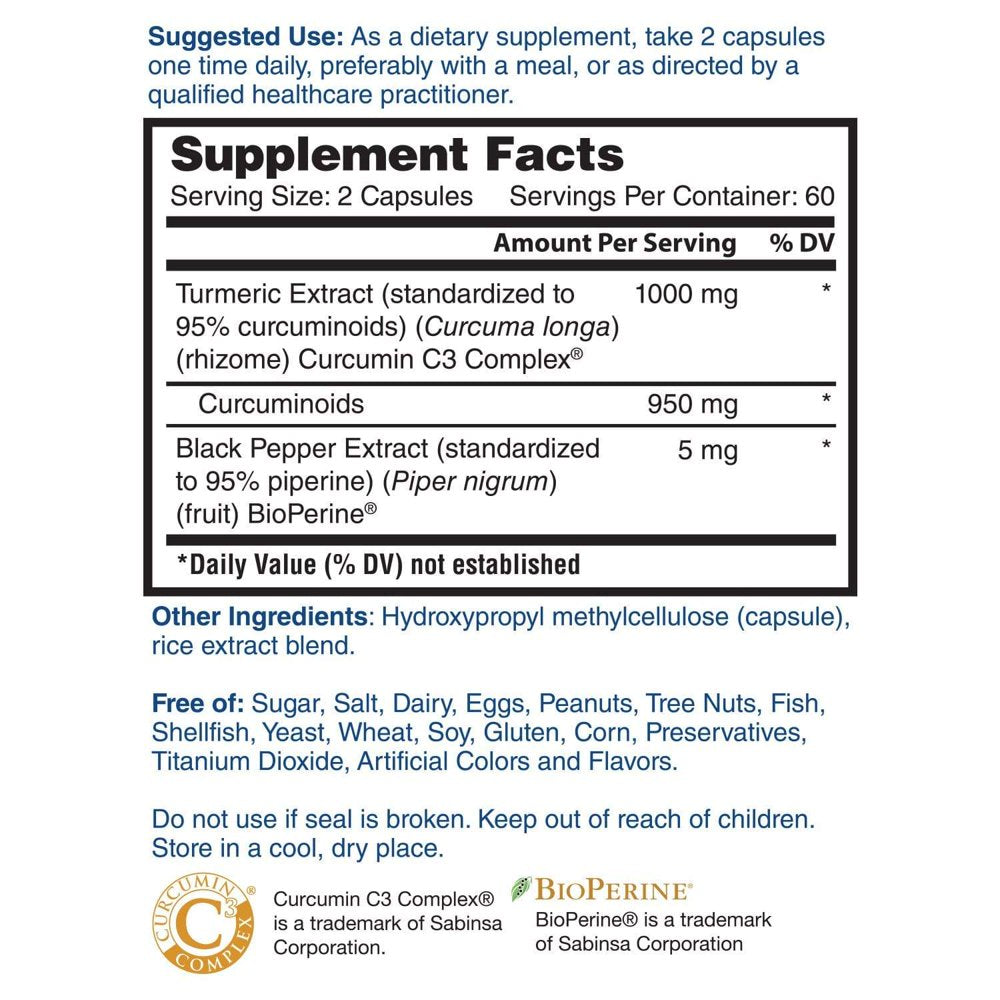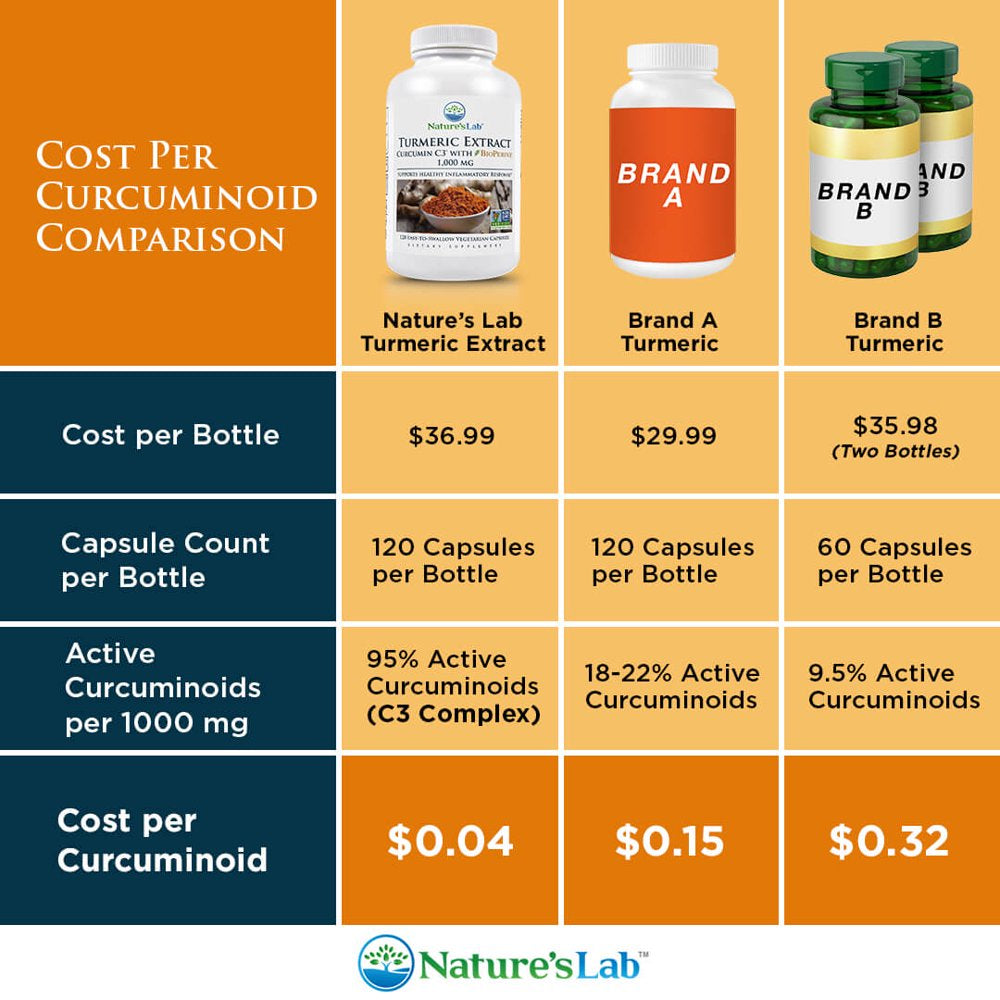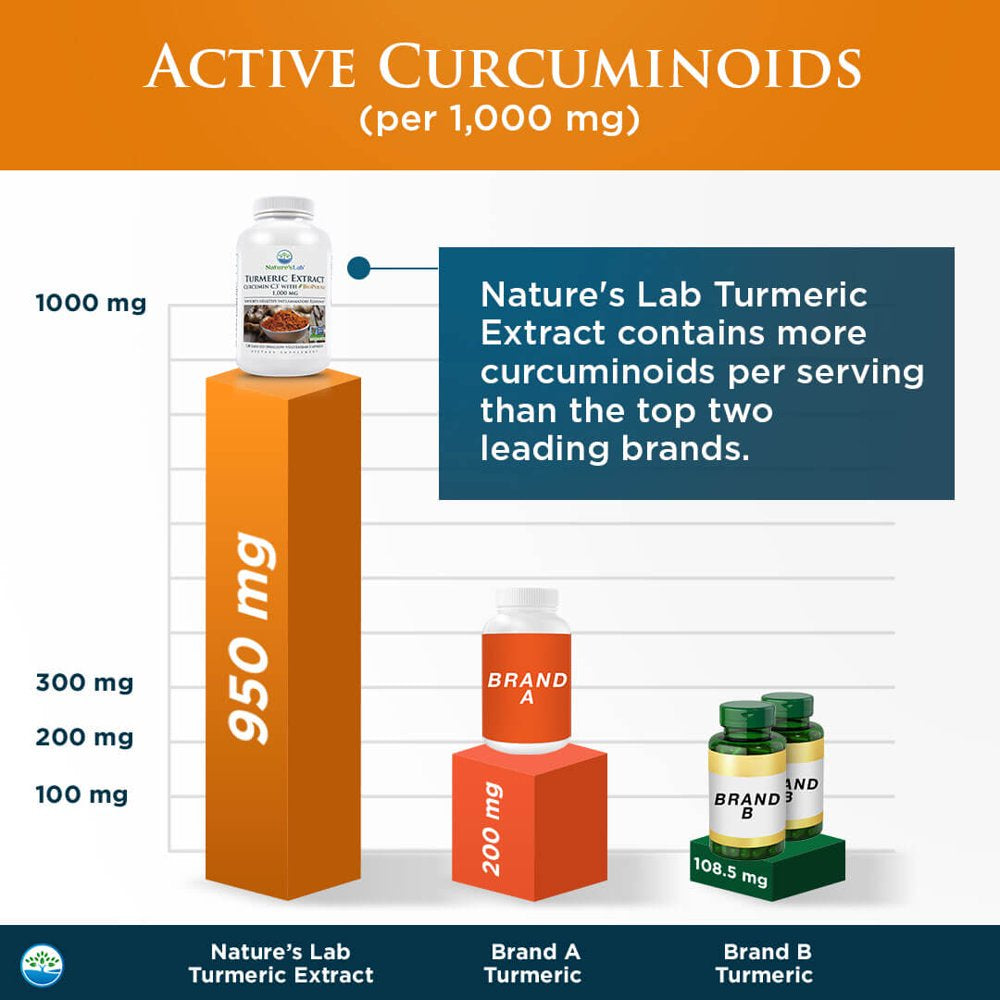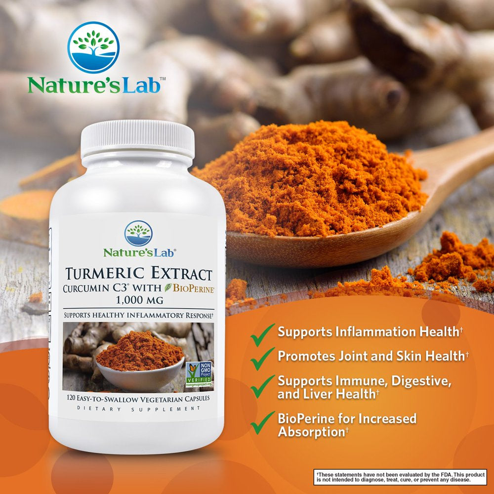 Nature's Lab Turmeric extract contains 1000mg of Turmeric Curcumin with 95% standardized curcuminoids per serving (highest potency) and 10mg of BioPerine (black pepper extract) aiding in enhanced absorption and bioavailability.* This formula features C3 Curcumin Complex which includes not only curcumin but two other natural curcuminoid compounds; demethoxycurcumin and bisdemethoxycurcumin for enhanced stability and bioavailabilty.* This turmeric formula promotes cardiovascular, immune, joint, and skin health.* The potent turmeric properties support a healthy inflammatory response and general wellness.* Turmeric curcumin benefits the brain, heart and circulatory system by helping to neutralize free-radicals.*