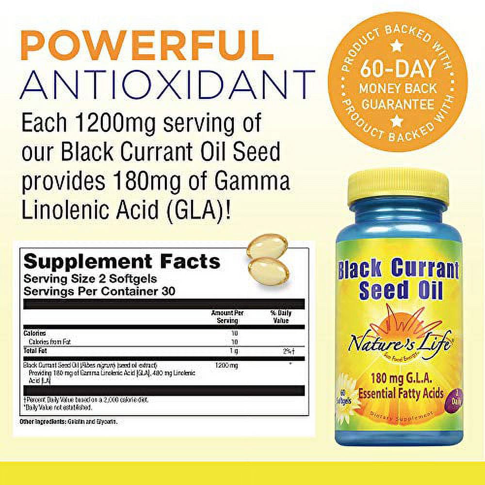 Packed with 1200 mg of Black Currant Seed Oil, each serving of this Natures Life product provides 180 mg of Gamma Linolenic Acid (GLA) and 480 mg of Linolenic Acid (LA). Full of essential fatty acids, our Black Currant Seed Oil may provide nutritive support for healthy skin, nails, joints and immune function. Thats a big delivery on health for such a small package.