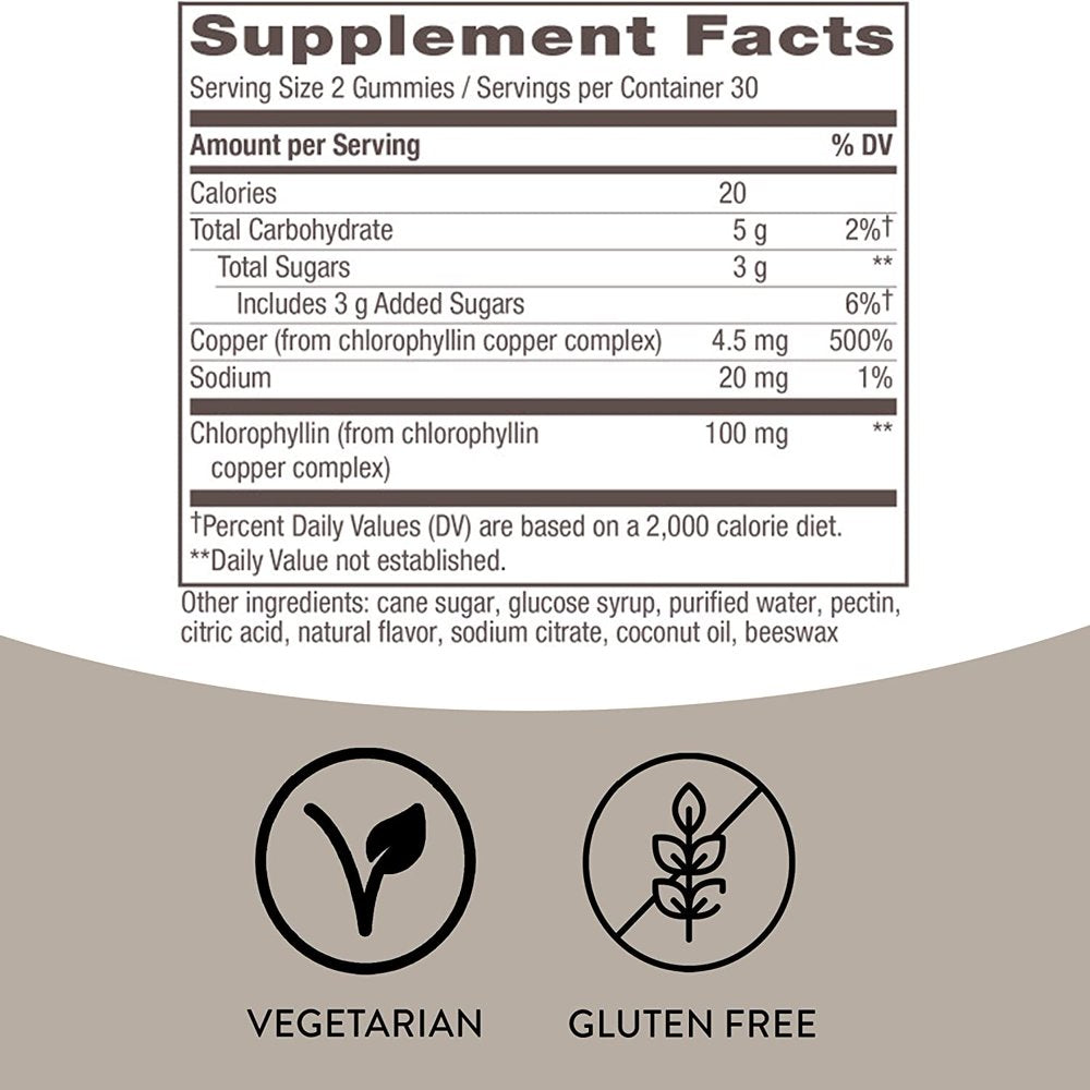 - Convenient, mess-free chlorophyll gummies made with plant-derived chlorophyllin copper complex to support healthy skin and body detox.*