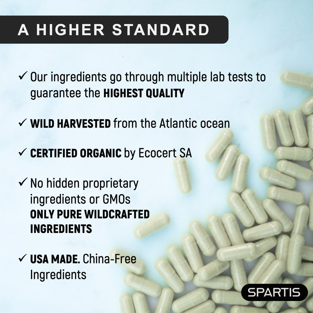 Made With Certified Organic Irish Sea Moss, Bladderwrack and Burdock Root. All Ingredients are Certified Organic by EcoCert, China-Free Ingredients and wildcrafted in the Atlantic Ocean to ensure the highest quality.,Irish Sea Moss, Bladderwrack and Burdock Root are packed with over 102 essential vitamins and minerals to create a superfood supplement that nourishes the body. Take for thyroid support, gut health, detoxification of the body, skin & joint health and overall immune system support.,Quality is our priority, so we go the extra mile to harvest our sea moss from the purest sources of the Atlantic Ocean. We commit to strict quality control to be able to have the Made With Certified Organic By EcoCert, seal of approval. We value transparency and provide no hidden proprietary blend ingredient counts. With 180 capsules at 2,250mg per serving of Sea Moss, we provide adequate value compared to others.,Enhanced absorption in capsule form with quality ingredients allows the body to take in Iron, Magnesium, Phosphorus, Zinc, Iodine and many more nutrients to effectively support the thyroid and overall immune system. We provide a convenient way to get the benefits of sea moss than gel and better absorption than gummies.,Made in the USA with Non-GMO and China-free ingredients. We ensure purity and potency by producing our product in a FDA registered, GMP certified facility that completes multiple 3rd Party lab tests at ISO certified labs.