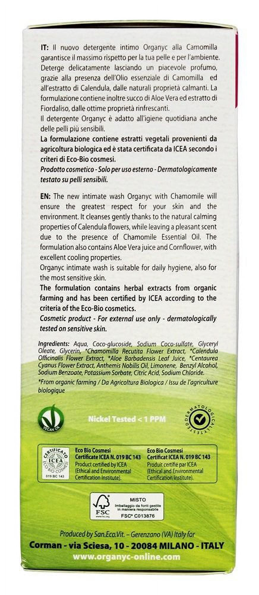 - CALM & SOOTHING - Organyc intimate wash is infused with chamomile essential oils and calendula flowers, both known for their soothing abilities.