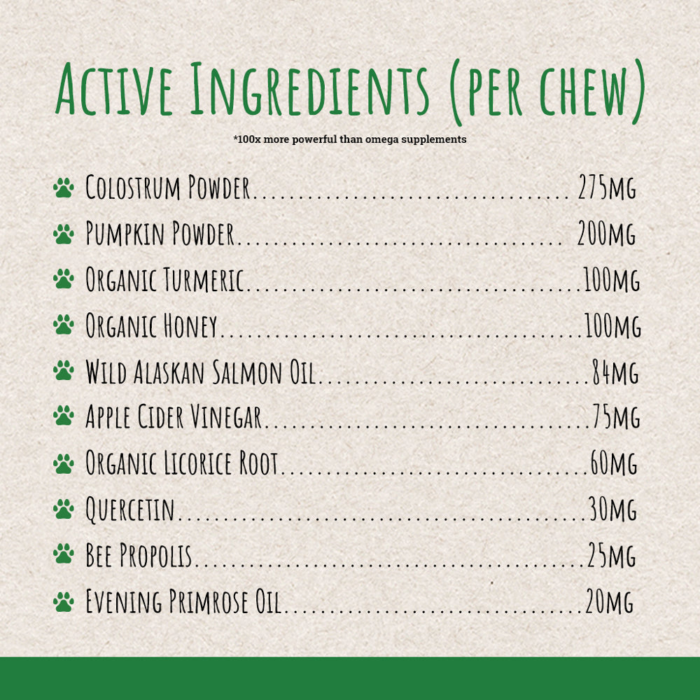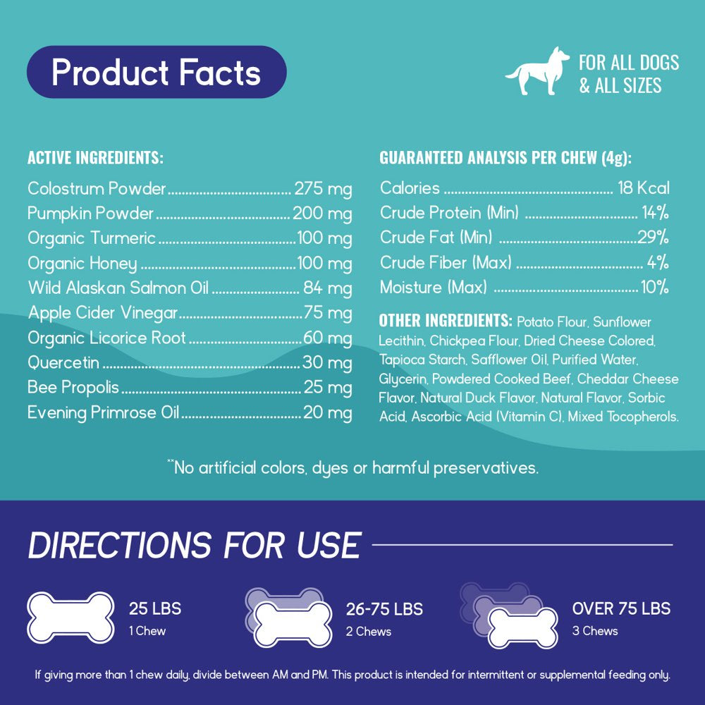 • BOOSTS IMMUNITY & GUT HEALTH - Fortified with Colostrum, Wild Alaskan Salmon Oil, and Licorice to boost immune response, reduce inflammation, and support healthy digestive function in dogs with seasonal, skin-related, dietary, or environmental allergies.