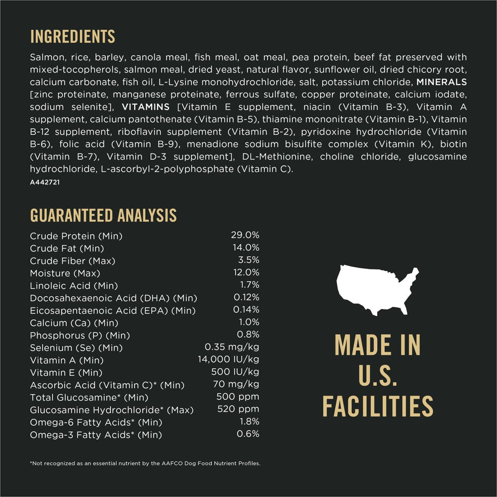 Salmon, Rice, Barley, Canola Meal, Fish Meal, Oat Meal, Pea Protein, Beef Fat Preserved With Mixed-Tocopherols, Salmon Meal, Dried Yeast, Natural Flavor, Sunflower Oil, Dried Chicory Root, Calcium Carbonate, Fish Oil, L-Lysine Monohydrochloride, Salt, Potassium Chloride, MINERALS [Zinc Proteinate, Manganese Proteinate, Ferrous Sulfate, Copper Proteinate, Calcium Iodate, Sodium Selenite], VITAMINS [Vitamin E Supplement, Niacin (Vitamin B-3), Vitamin A Supplement, Calcium Pantothenate (Vitamin B-5), Thiamine Mononitrate (Vitamin B-1), Vitamin B-12 Supplement, Riboflavin Supplement (Vitamin B-2), Pyridoxine Hydrochloride (Vitamin B-6), Folic Acid (Vitamin B-9), Menadione Sodium Bisulfite Complex (Vitamin K), Biotin (Vitamin B-7), Vitamin D-3 Supplement], DL-Methionine, Choline Chloride, Glucosamine Hydrochloride, L-Ascorbyl-2-Polyphosphate (Vitamin C). A442721/div>