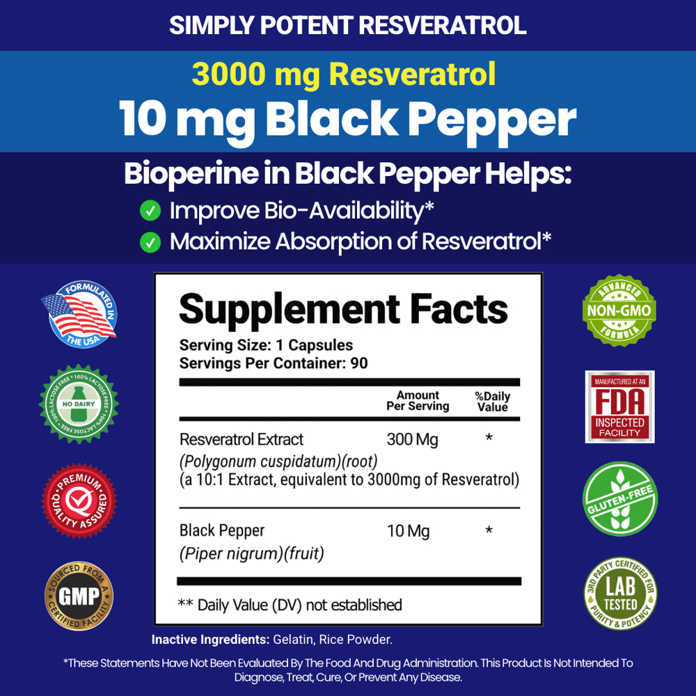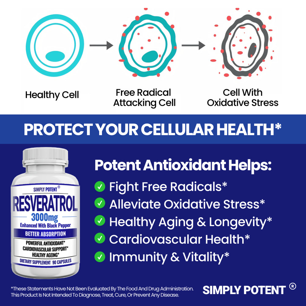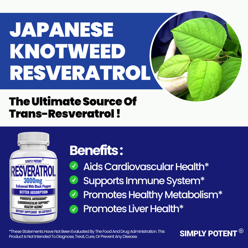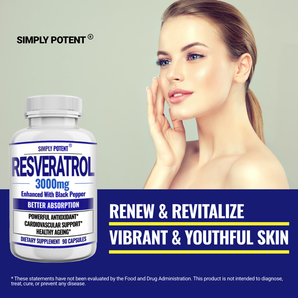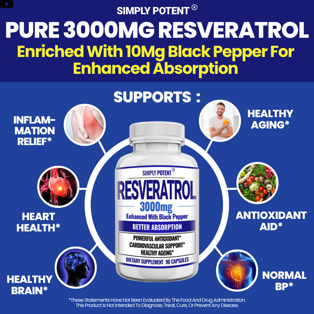SIMPLY POTENT RESVERATROL 3000 mg Resveratrol + 10 mg Black Pepper, 90 Capsules Max Absorption Formula With High Trans Resveratrol Powerful Anti-Aging Antioxidant Supplement For Healthy Heart, Vibrant Skin, Immunity & Brain Health.