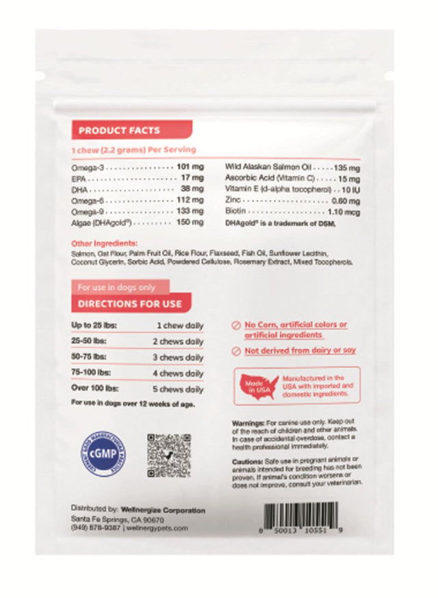 • PREMIUM INGREDIENTS THAT GIVE RESULTS- NO GMOs, CORN, SOY or PRESERVATIVES - At Wellnergy Pets we’re committed to premium quality ingredients and strict safety standards in all our products. Our Skin and Coat Support supplement soft chew is made in the USA with only the highest-quality natural ingredients.