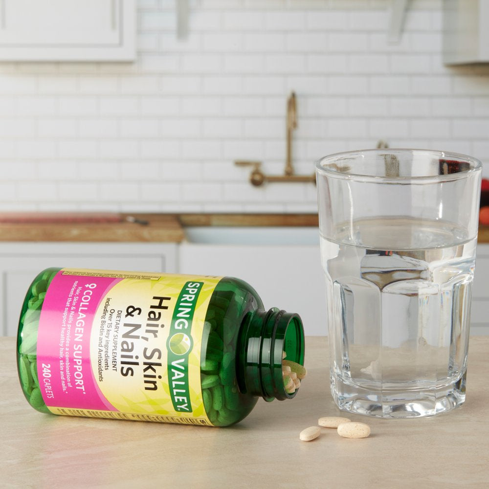 Spring Valley Hair, Skin & Nails Dietary Supplement contains over 15 key ingredients, including biotin and antioxidants, to provide a combination of nutrients that support healthy hair, skin, and nails. The recommended dosage is three capsules daily, preferably with a meal. With 240 caplets per bottle, you'll have enough for 80 days. You can rest assured our Spring Valley Hair, Skin & Nails Dietary Supplement is produced with strict quality guidelines and backed by our quality guarantee.