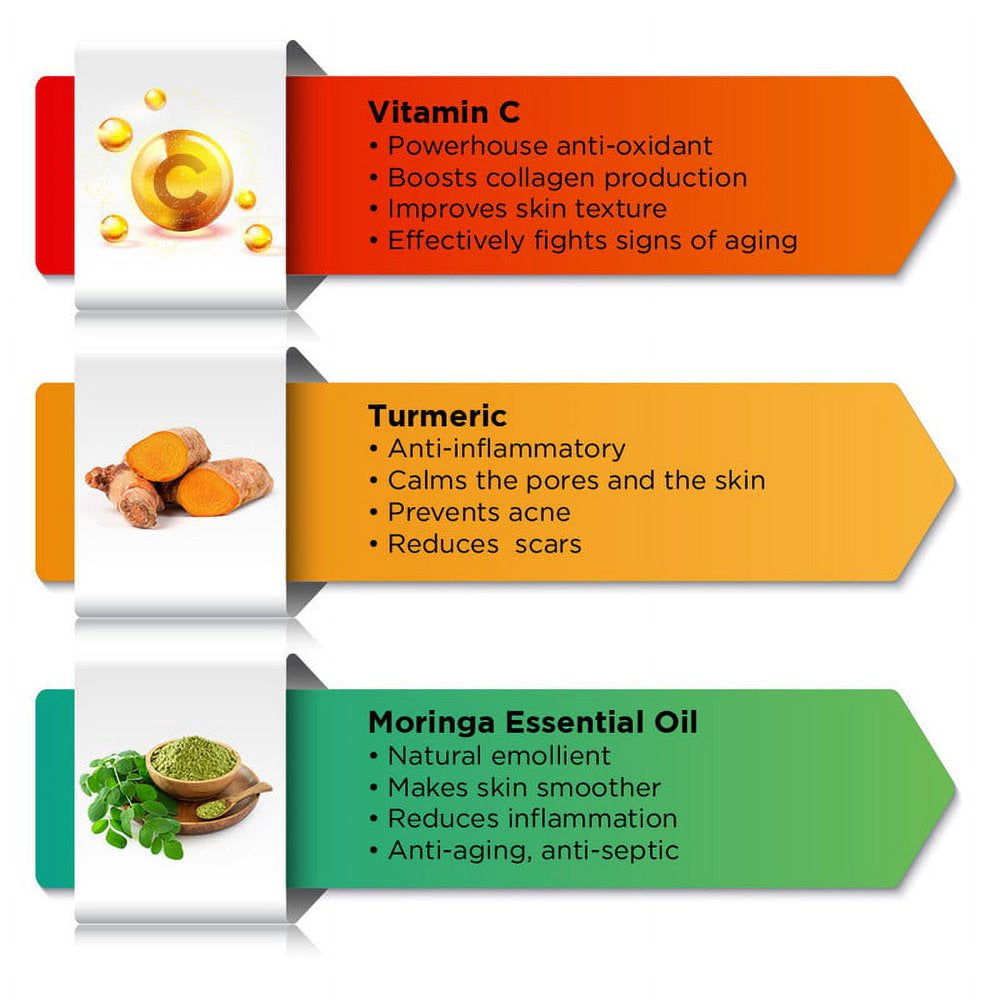 - Vitamin C: Powerhouse anti-oxidant | Boosts collagen production, improving skin texture and fading fine lines and wrinkles | Prevents hyperpigmentation – adds radiance to the skin, evens skin tone | Fights damage from sun & pollution