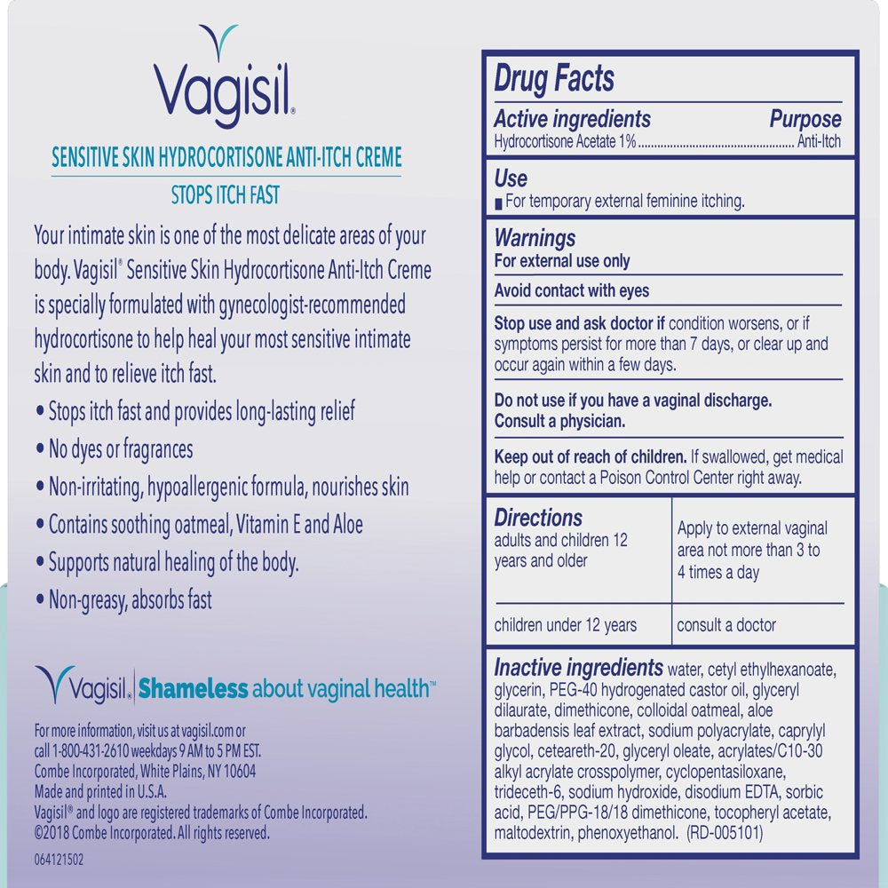 Treat the most sensitive areas on your body with the Vagisil Anti-Itch Vaginal Cream. Your intimate skin is one of the most delicate areas of your body, and if yours is particularly sensitive, it can even be itchy, painful, and distracting. It's understandable that you don't want to use any anti-itch products that may be irritating or harsh. Vagisil Sensitive Skin's anti-irritation cream is formulated to relieve itch on the most sensitive intimate skin, similar to how anti-itch antibiotic cream works. Vagisil Anti-Itch Vaginal Cream effectively relieves itching from vaginal fungal infection. Treatment for itching is made easy with our maximum strength formula. Get relief for itch at home with a 1 oz. tube of natural Vagisil feminine itch cream today.