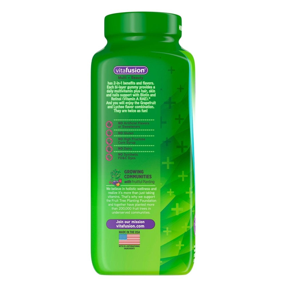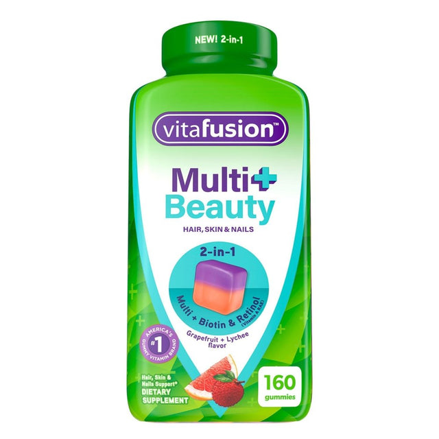 Vitafusion Multi Beauty + Daily Multivitamin Gummy, Hair, Skin & Nails (160 Ct) New from America’s #1 Gummy Vitamin Brand, Vitafusion Multi+ Beauty Bilayer Gummies have 2-in-1 benefits and tasty fruit flavors. Each bilayer gummy provides a daily multivitamin plus hair, skin and nails support with Biotin and Retinol (Vitamin A RAE). And you'll love the delicious Grapefruit and Lychee flavor fusion! Each two gummy serving of these vitamin gummies provides an excellent source of 12 vitamins and minerals with as much Vitamin A as a cup of broccoli, as much Vitamin C as one tangerine, and as much Vitamin D as 5 ounces of salmon. Each flavorful and nutritious beauty plus multivitamin gummy is made with no artificial flavors or sweeteners, no gluten, no high fructose corn syrup, no dairy, and no synthetic FD&C dyes. Providing you with delicious and clean nutrition.
