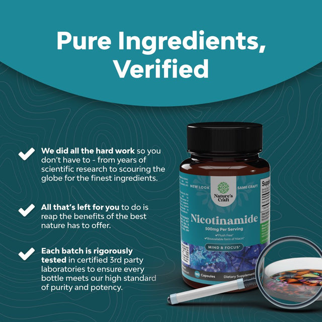 • Many Names Same Great Product - B3 vitamins go by many names but rest assured our niacinamide supplement is packed with pure and simple nicotinamide 500 mg a more optimized form of no flush niacin.