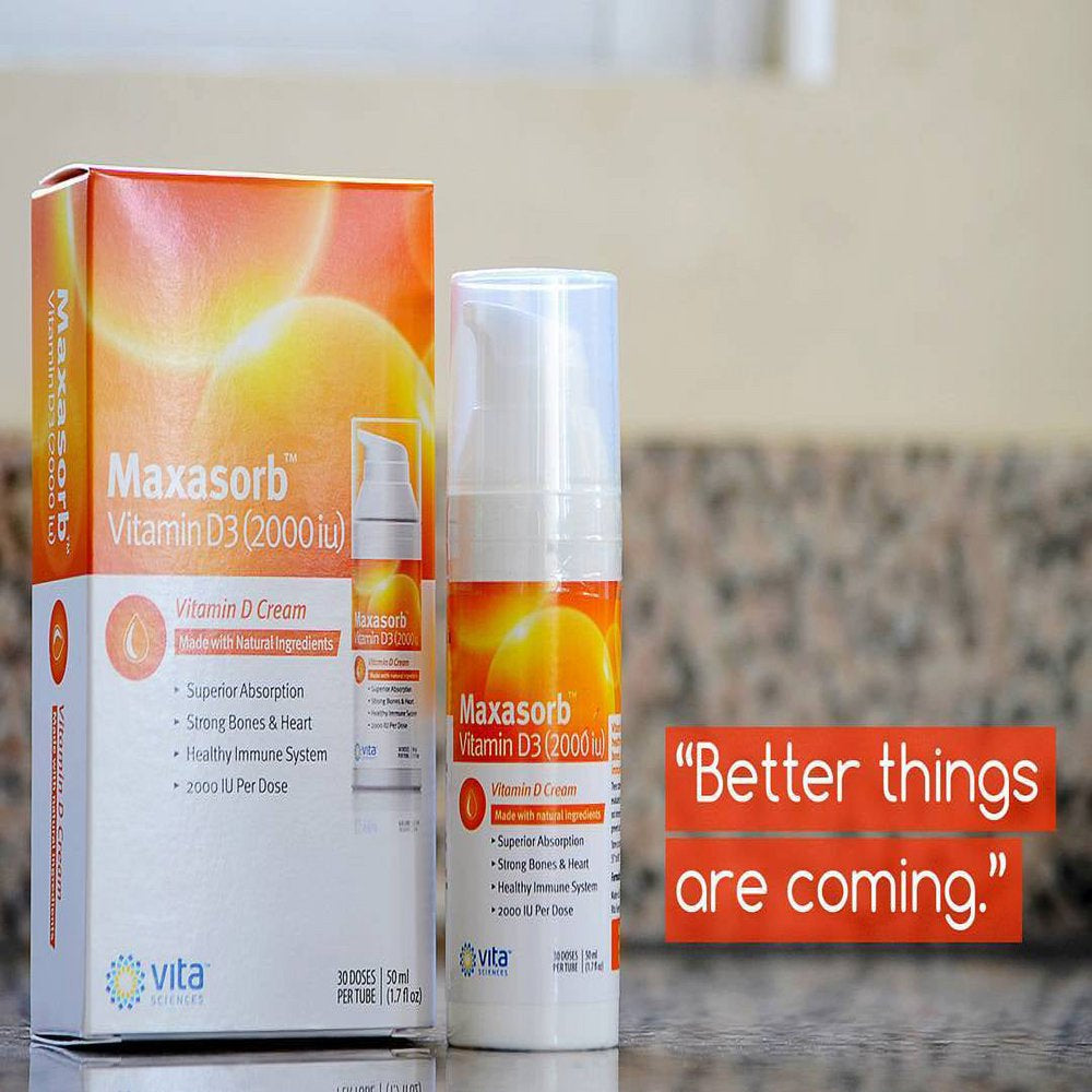 Vitamin D3 in a Vitamin D Cream. Vitamin D Cream safe for Psoriasis Sufferers, Vitamin D Cream with Vitamin D for Skin, Body, Face Cream For Itchy Skin, Dry Skin, with a Natural Coconut Oil Base. Advanced Vitamin D Vitamin D3 2000 IU this is double the amount of Vitamin D 1000 IU. Each measure from our airless dispenser Vitamin D lotion delivers 2,000 IU of vitamin D3 with two full pumps. For best results, apply our highly-absorbent vitamin D3 cream each day, rubbing into your arms or legs as needed. Our odorless nutrient-rich formula will dissolve effortlessly into your skin, providing maximum vitamin absorption. Maxasorb D3 lotion uses only natural, safe ingredients and is paraben free. Give your skin the nutrients it needs.