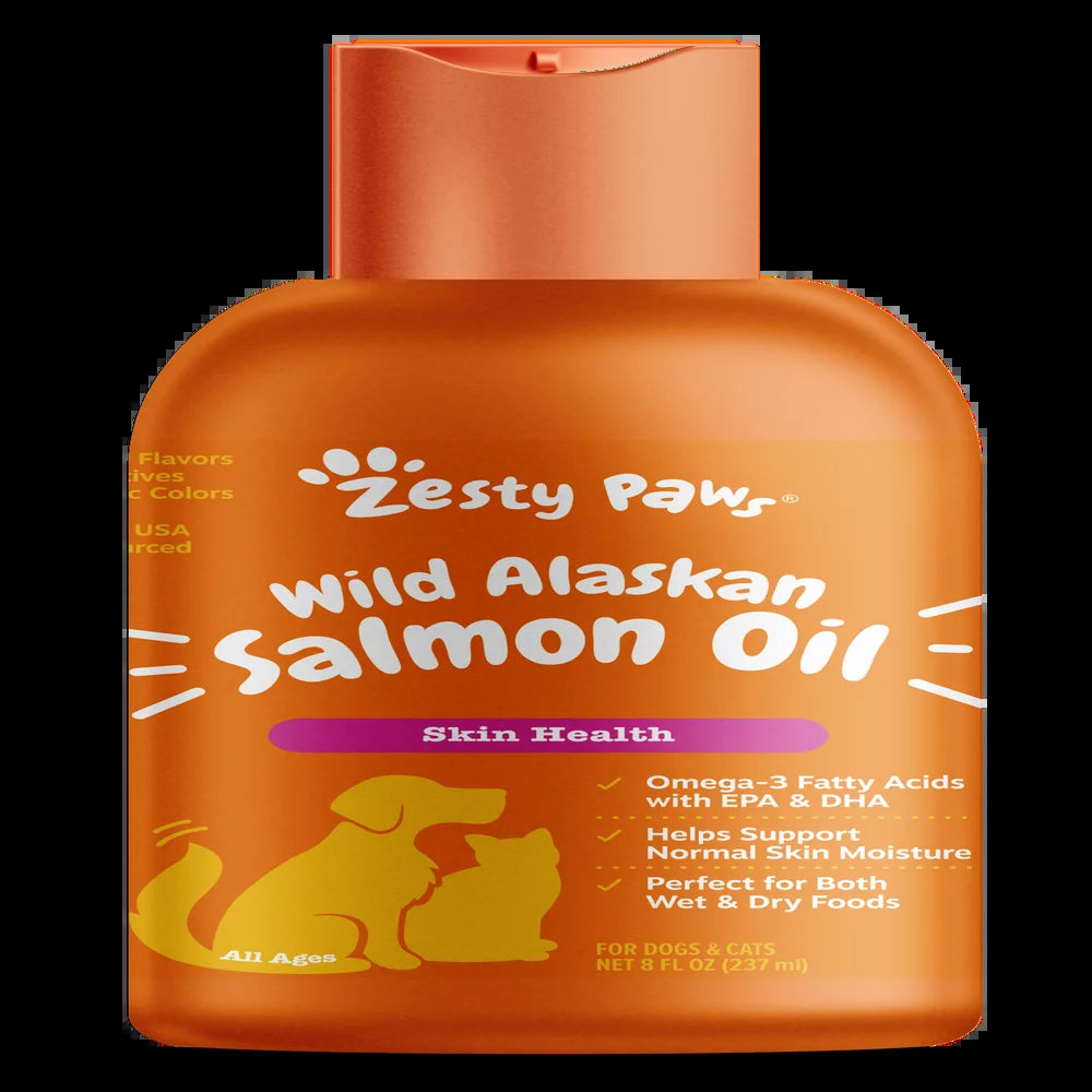 As a source of Omega-3 fatty acids (EPA and DHA), Zesty Paws mouthwatering Wild Alaskan Salmon Oil is a premium fish oil that provides support as a skin health booster to help canine and feline pets - large or small - look as great as they feel. Your dog and cat will surely get hip to it and love it!